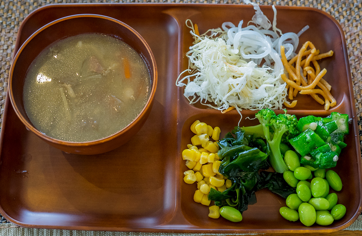 料理にはサラダや蕎麦の天ぷらに具がたっぷりな豚汁とかがフリー。