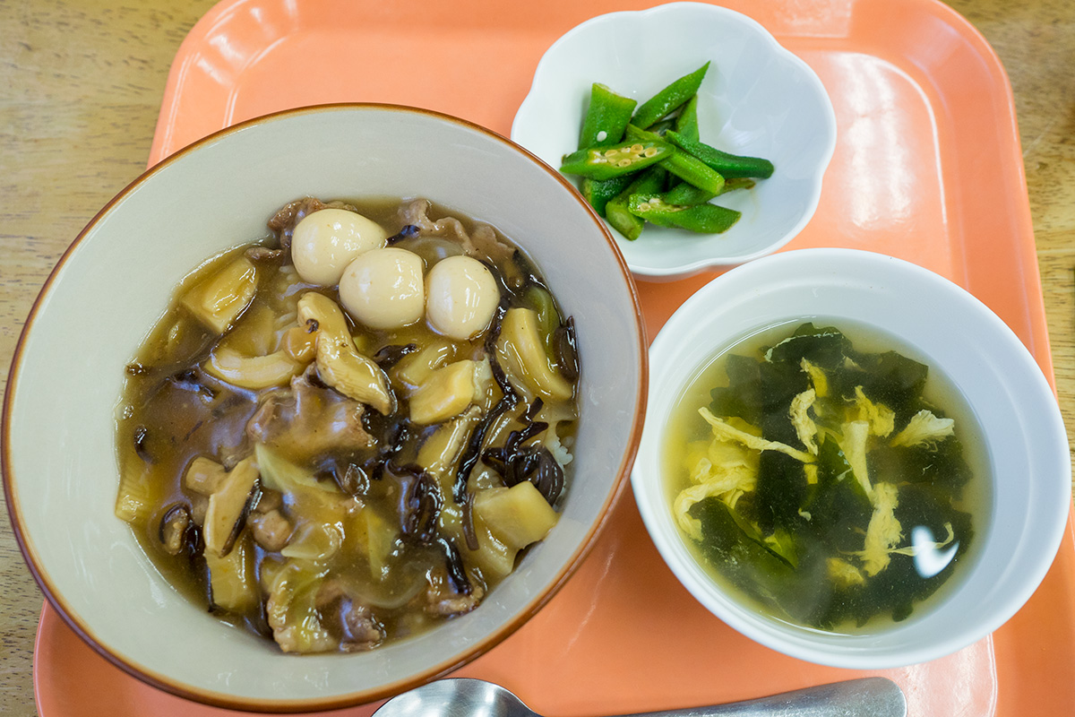 具がたっぷりな中華丼に、オクラのおひたしにわかめと卵のスープつき。