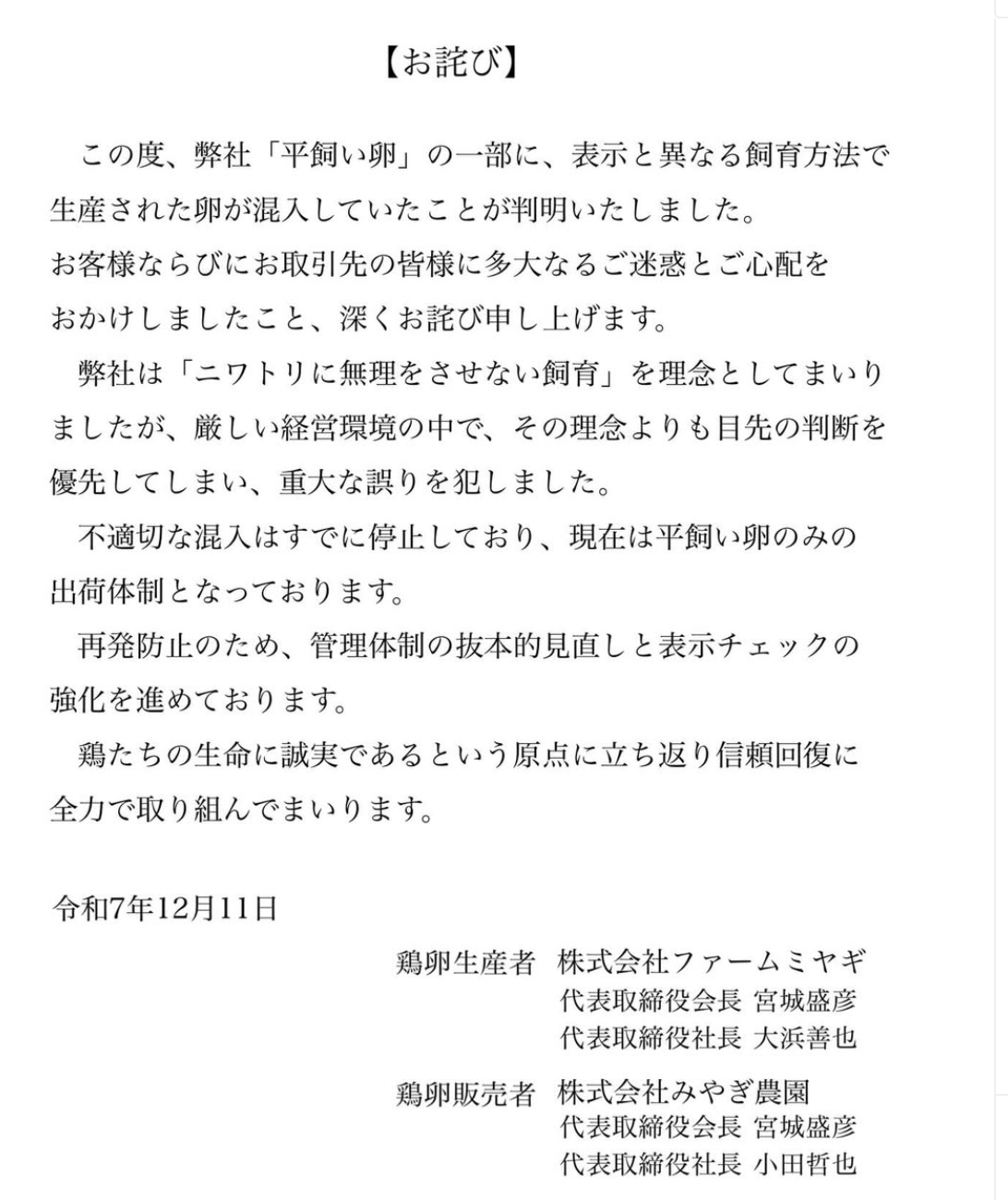 「みやぎ農園」が、「平飼い」ではない卵を「平飼い」と偽って販売していたことを同社は12/11、公式インスタグラムとfacebookと新聞で「お詫び」とする謝罪文を掲載したようだ。 Continue reading