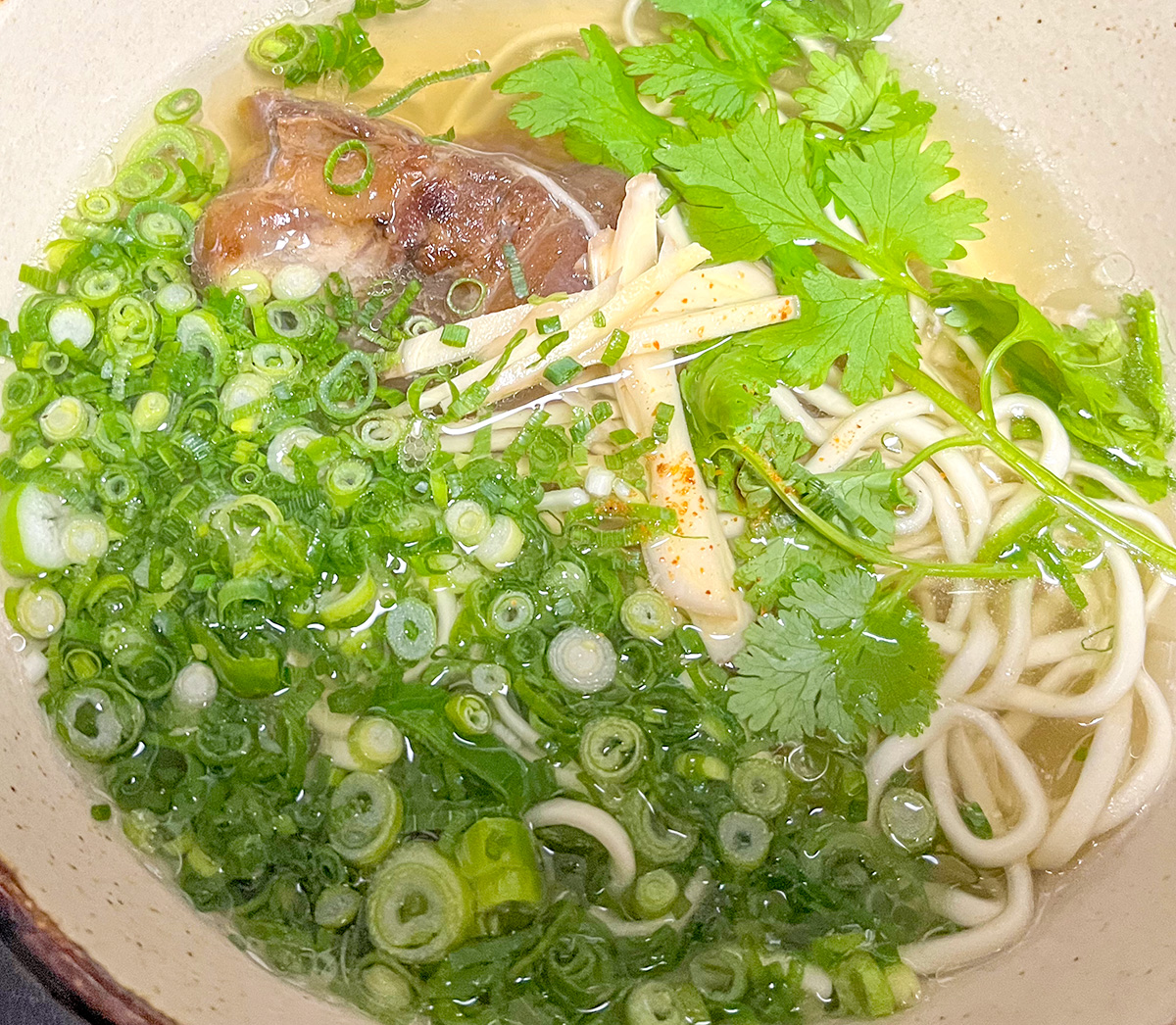 私の琉宮沖縄そばは、軟骨ネギたっぷりで細切り酢漬け生姜とパクチートッピング。