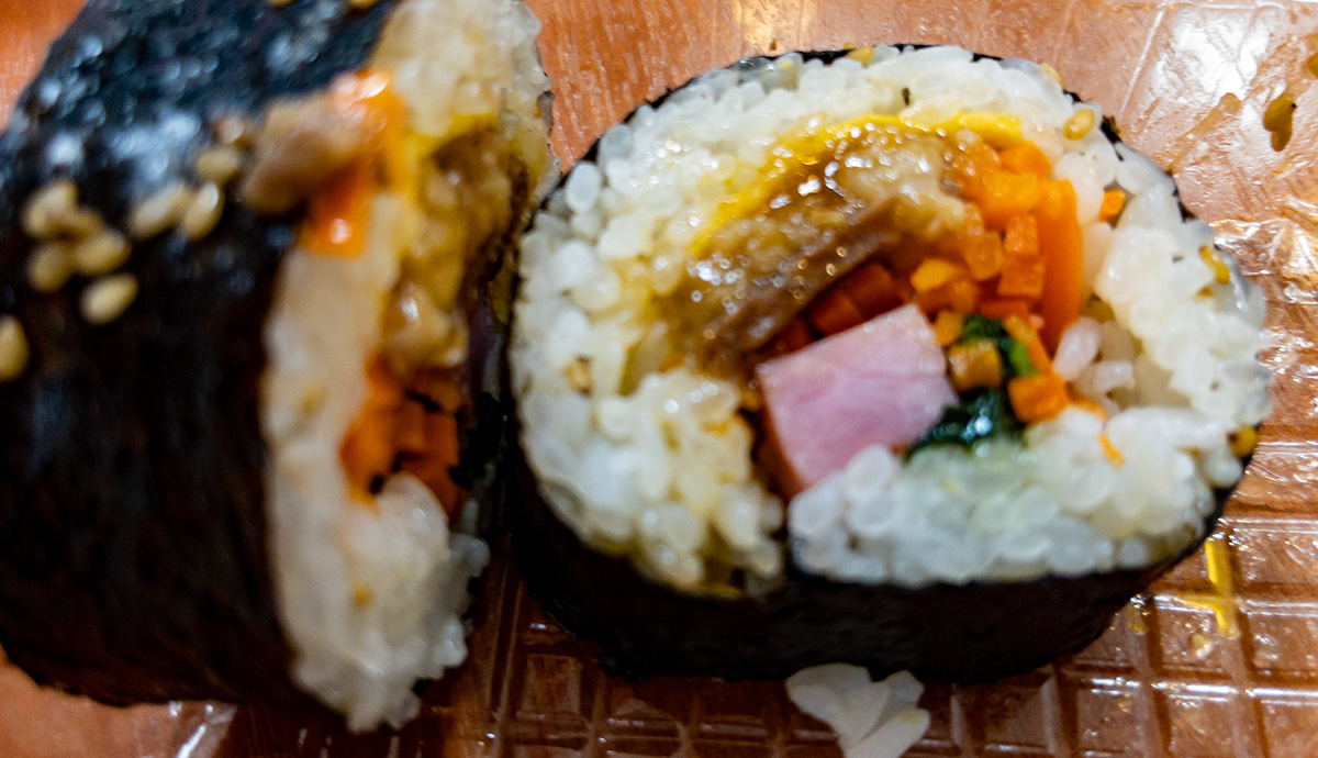 甘辛く味付けした牛焼肉と人参ナムルやたくあん、ハムなどが入った具だくさんの一品。