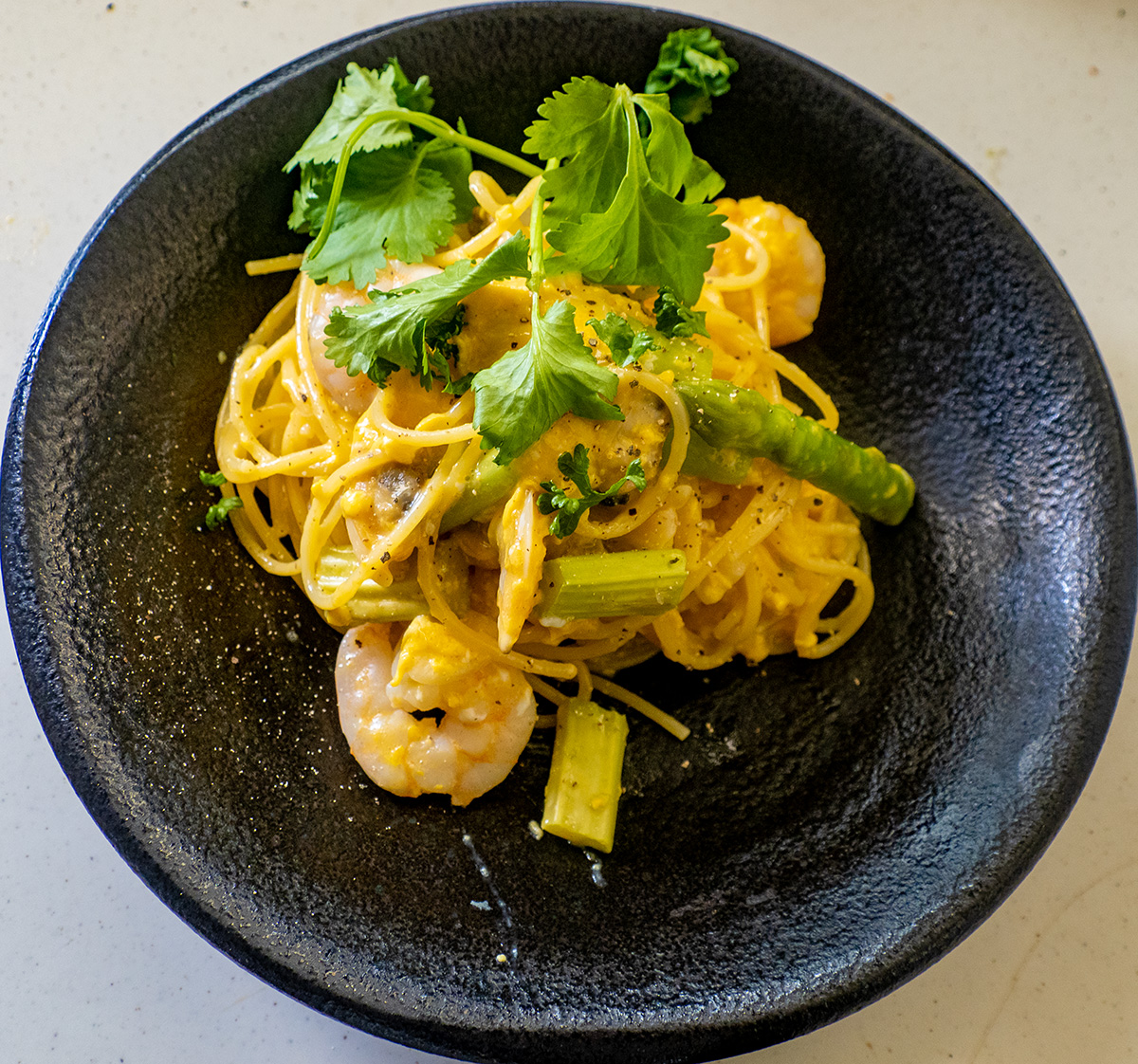 皿に盛ったら最後にパクチートッピングでフィニッシュ。あとは食べるだけ。