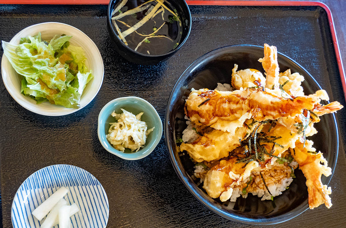 大海老というか特大海老天が2本に苦味あるゴーヤー、ナス、うりずん豆にさつまいもとかの野菜天と刺身に卵焼き、肉ごぼう巻きなどがついてる。