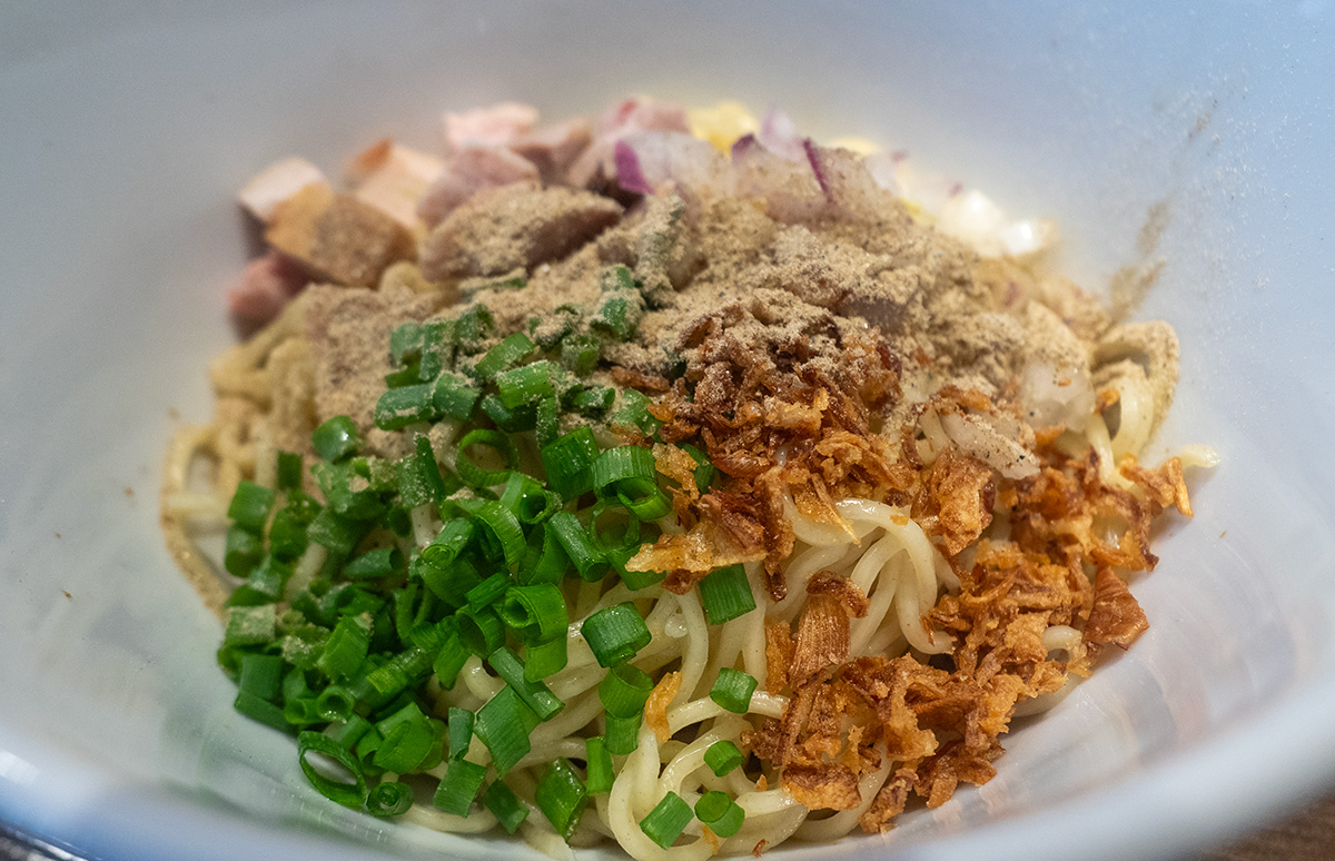 たっぷりの麺の上に、小口切りのチャーシュー、玉ねぎ、ねぎや魚粉がトッピングされていて、混ぜ合わせて食べると味は濃いめなので魚粉の酢を回しかけるといい感じ。