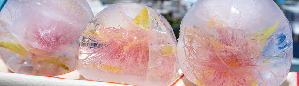 朝には落ちてしまうサガリバナを拾って丸い氷のできる中に入れてみた。