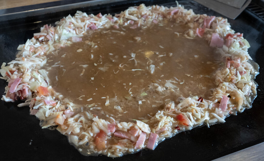 甘口ソースをメインに辛口も少し塗ったら、青のり、マヨネーズにたっぷり鰹節をふりかけたら、あとはコテで切って食べるのみ。