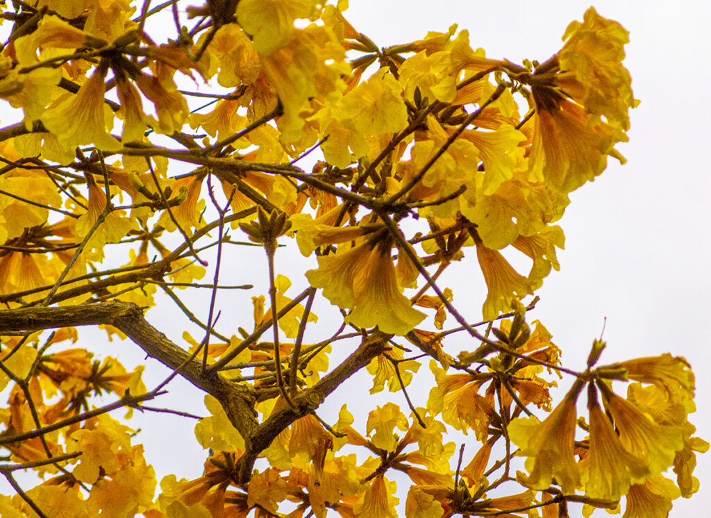 イペーの黄色い花があちらこちらで満開だ。南米先住民語のトゥピ語で皮の厚い木という意味らしい。これもブラジルから渡来したのかな。