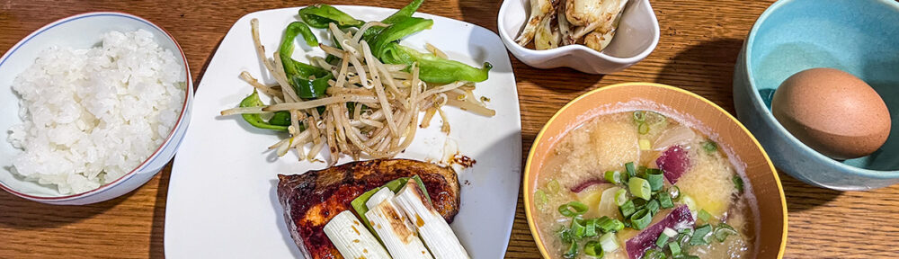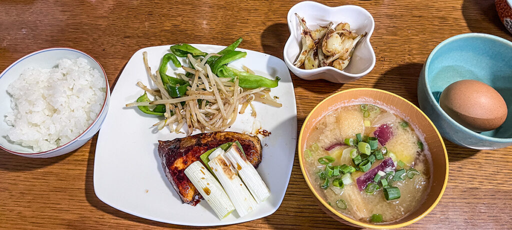 夕食にその玉子もプラス。夕食のブリ照りとネギと島ラッキョウを食べたら、