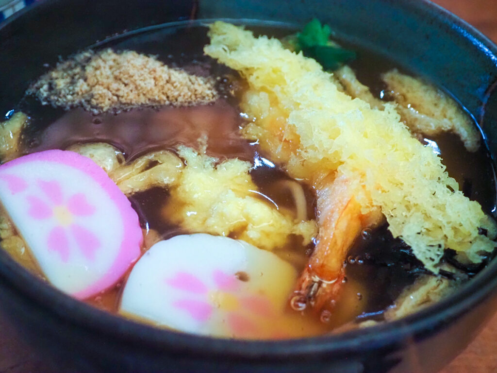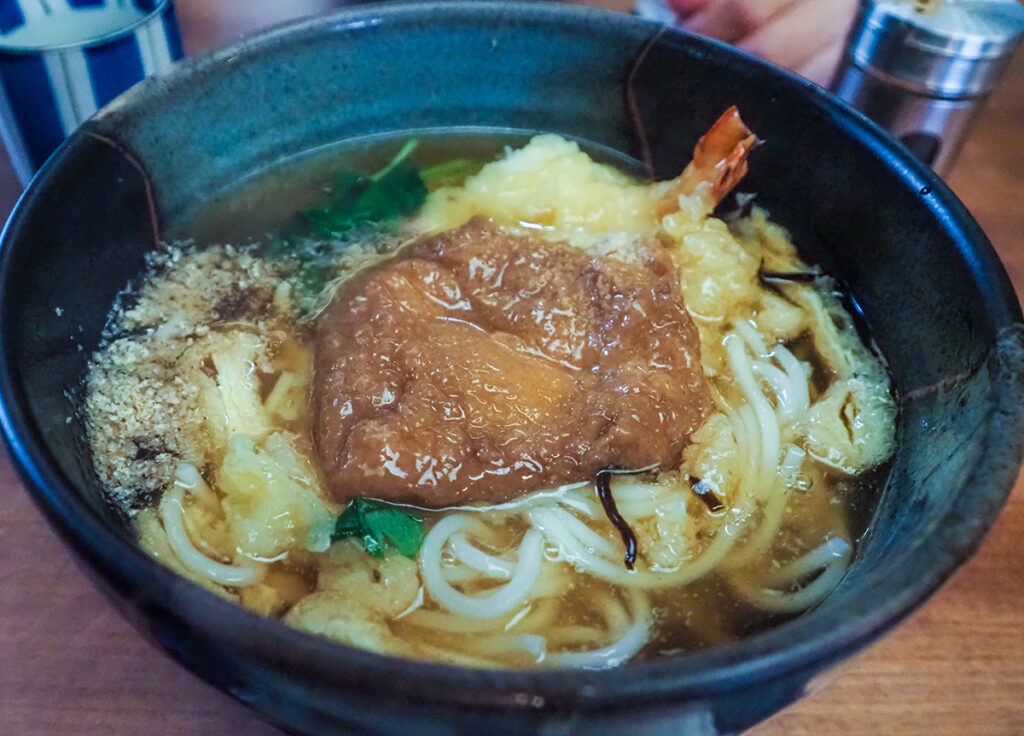 なので、ささめうどんに、大きな海老フライと甘いきつねをトッピング。