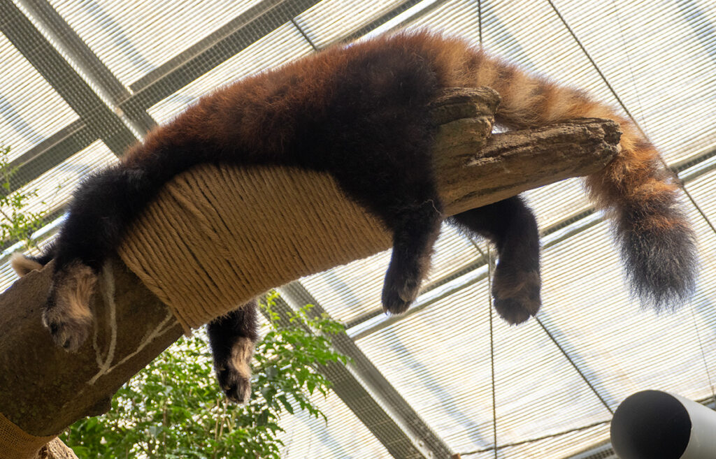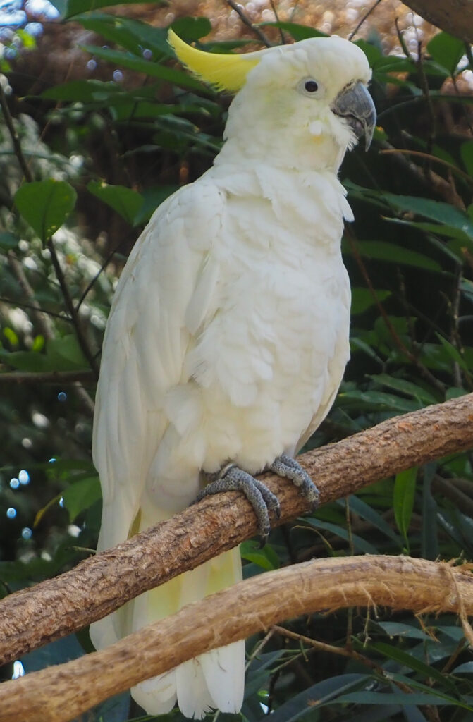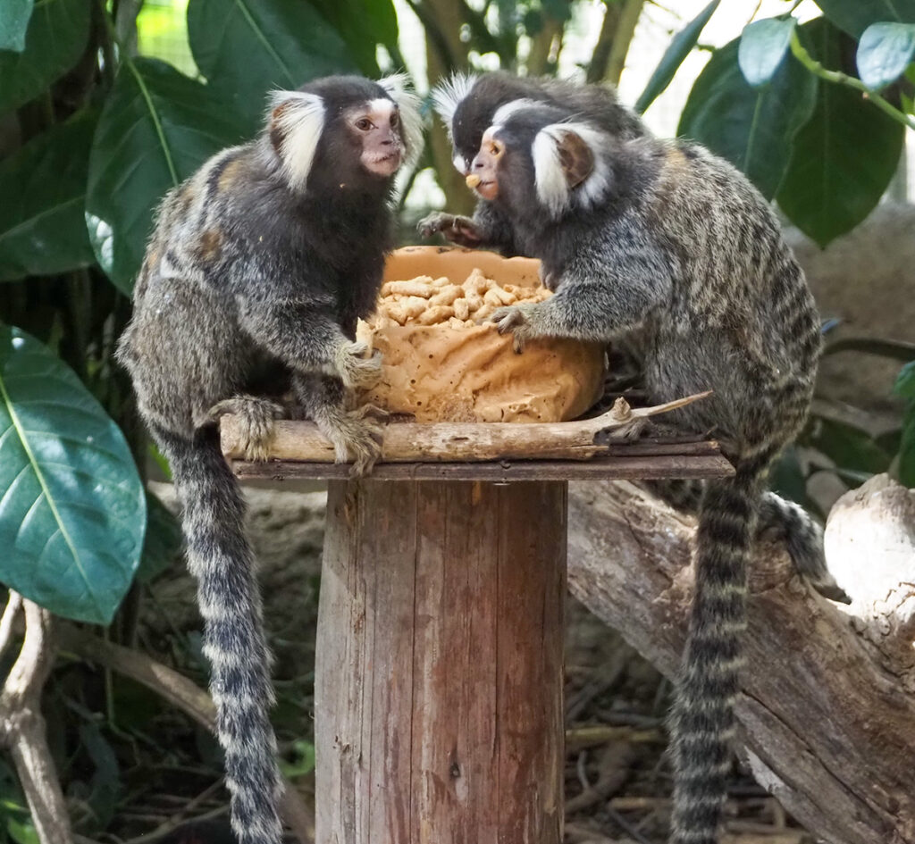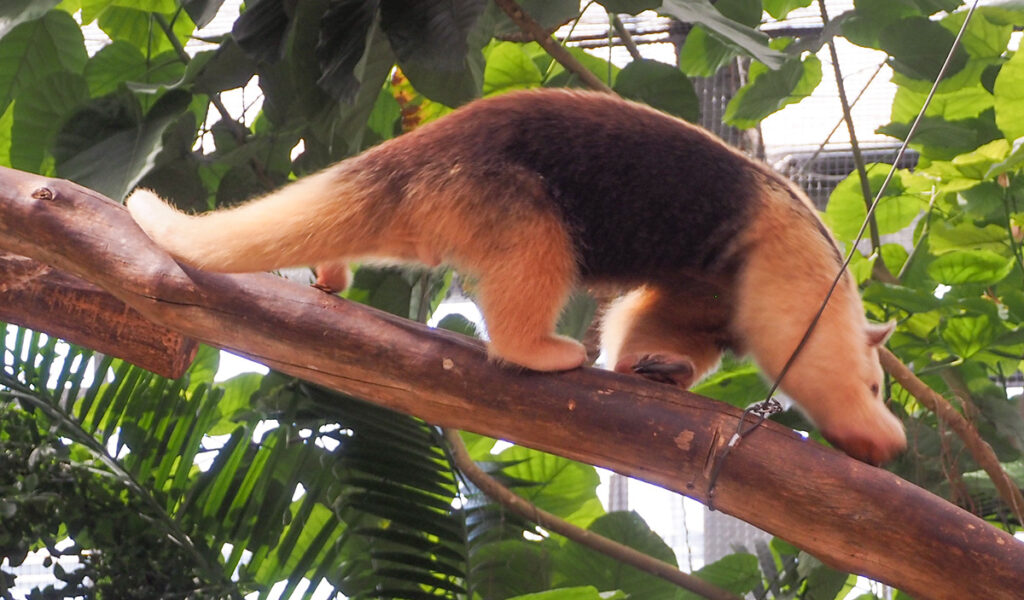 間近でアリクイが木を歩いたり、猿が餌を食べていたり、大きなオウムがいる。
