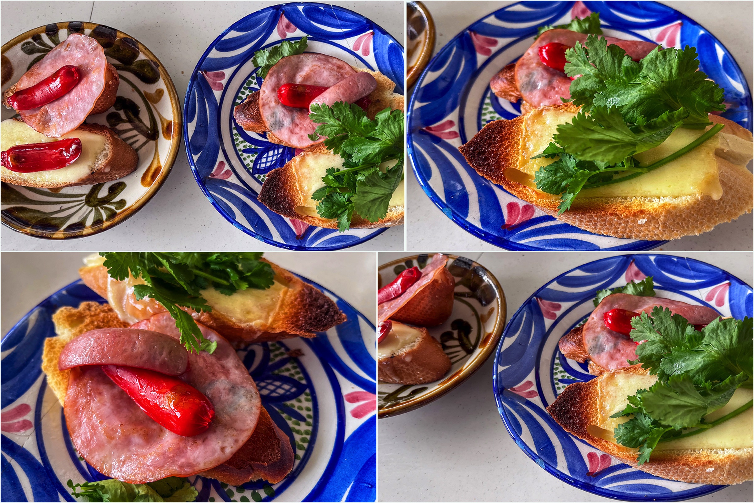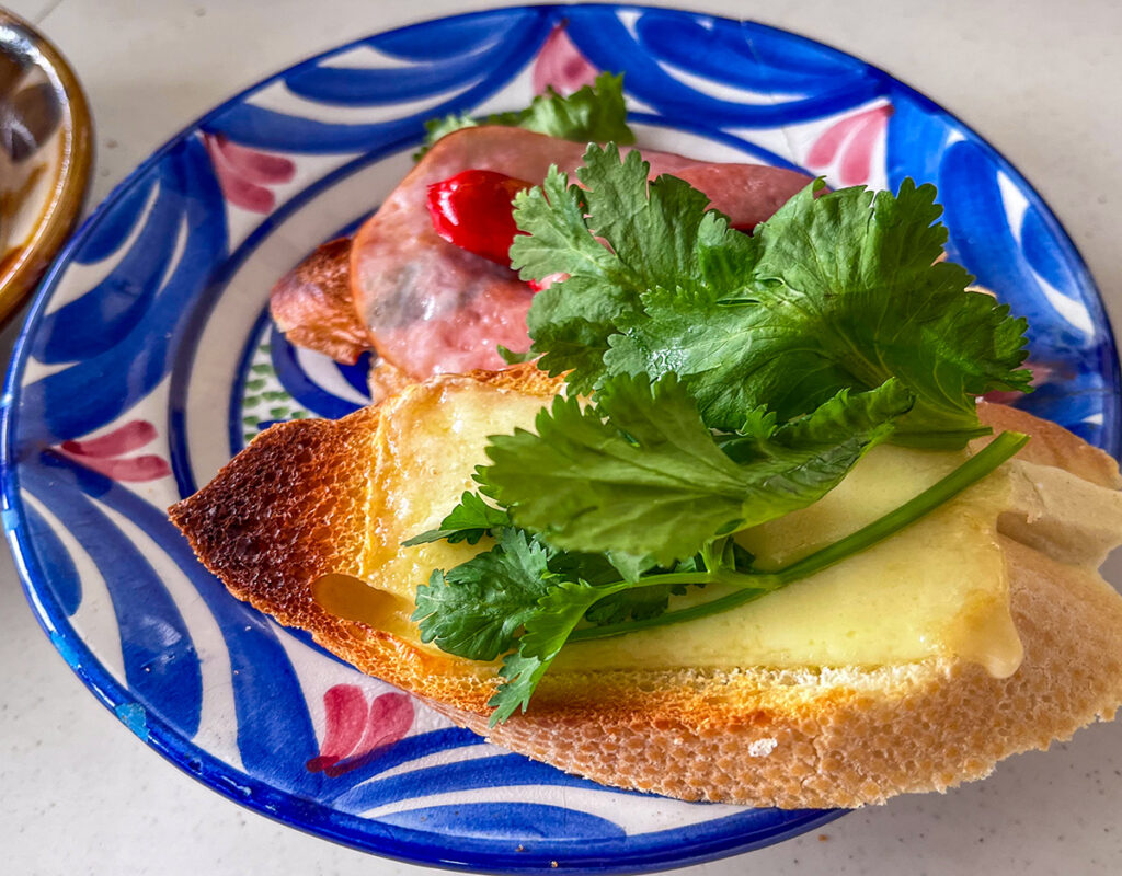 メルティングチーズを乗せて焼いて溶かしたあとに焼いたハムとソーセージと仕上げにパクチーをトッピング。