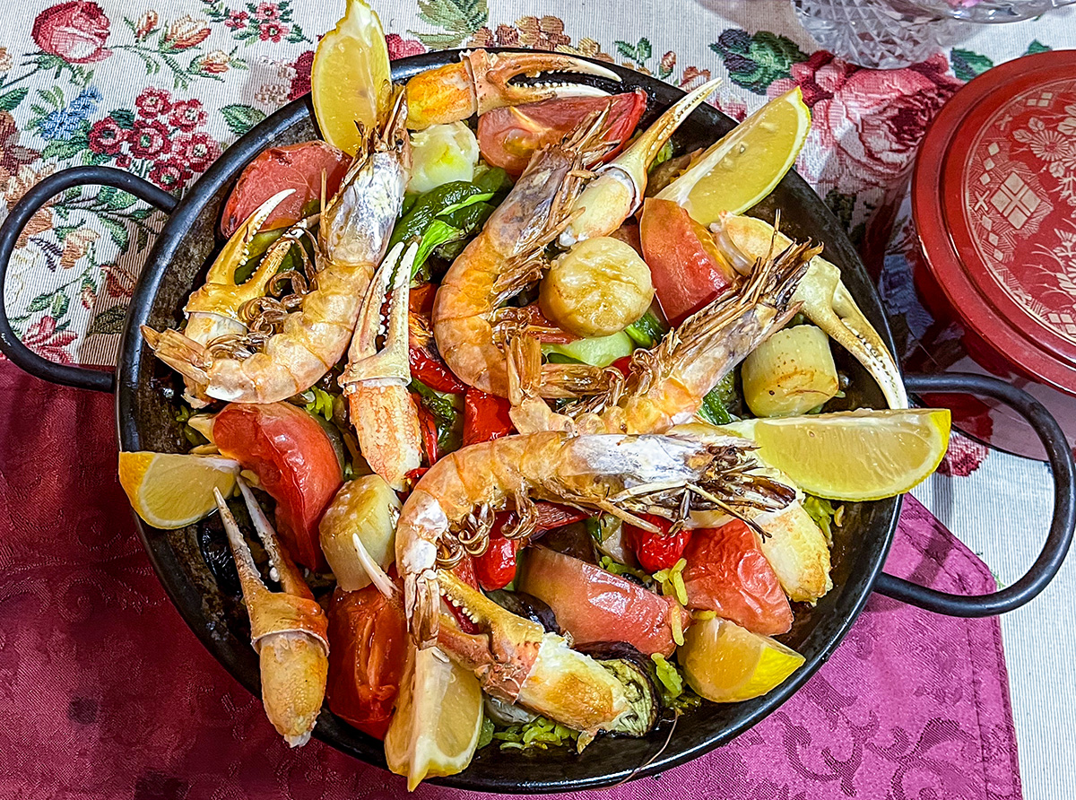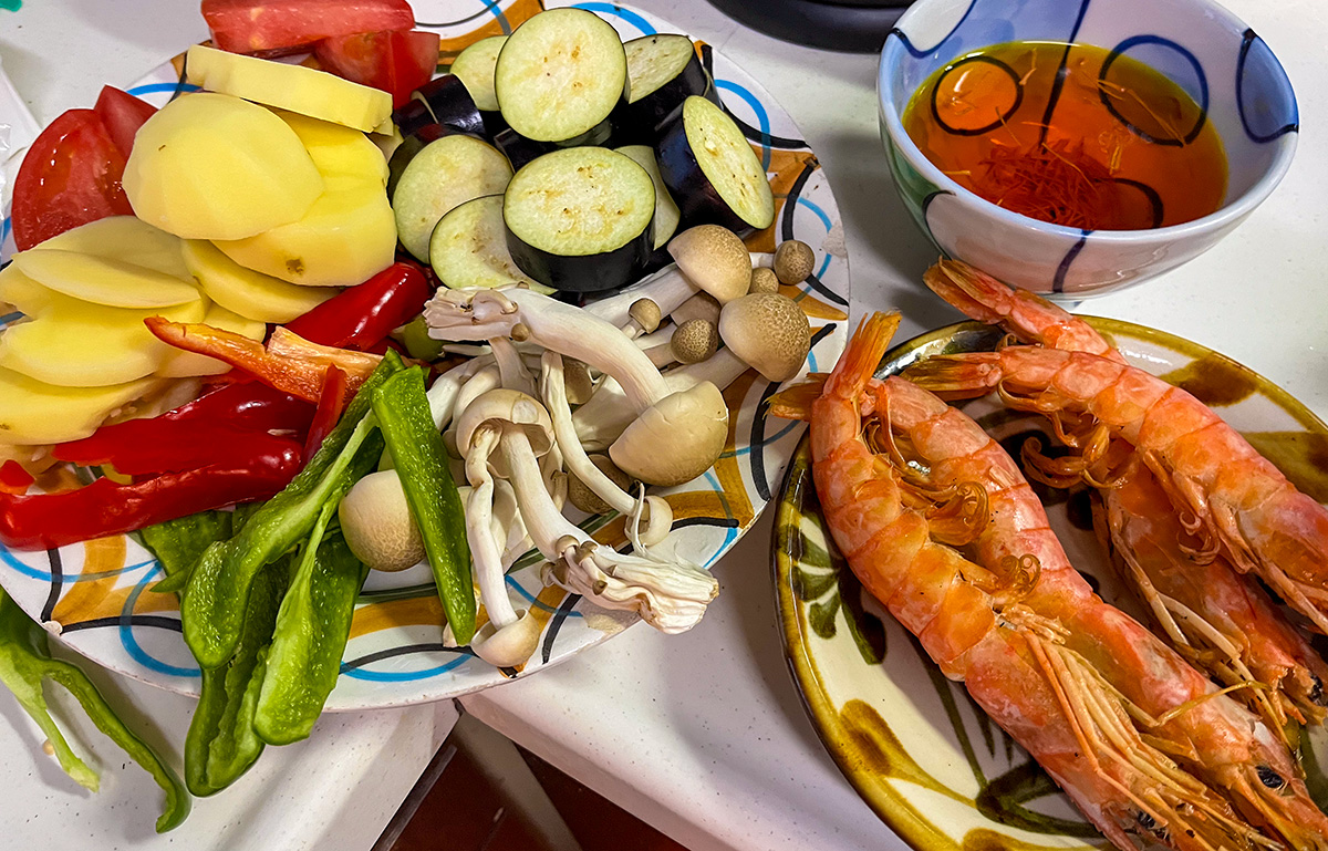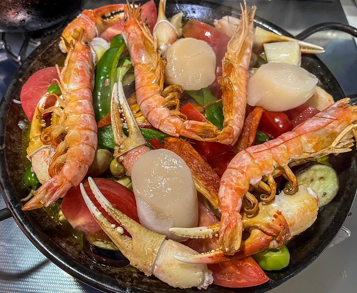 ジャスミン米をニンニクとオリーブオイルで炒めサフラン水を加え、沸騰させたら具材をのせ、220度にあっためたオーブンに30分ほどいれたら出来上がり。