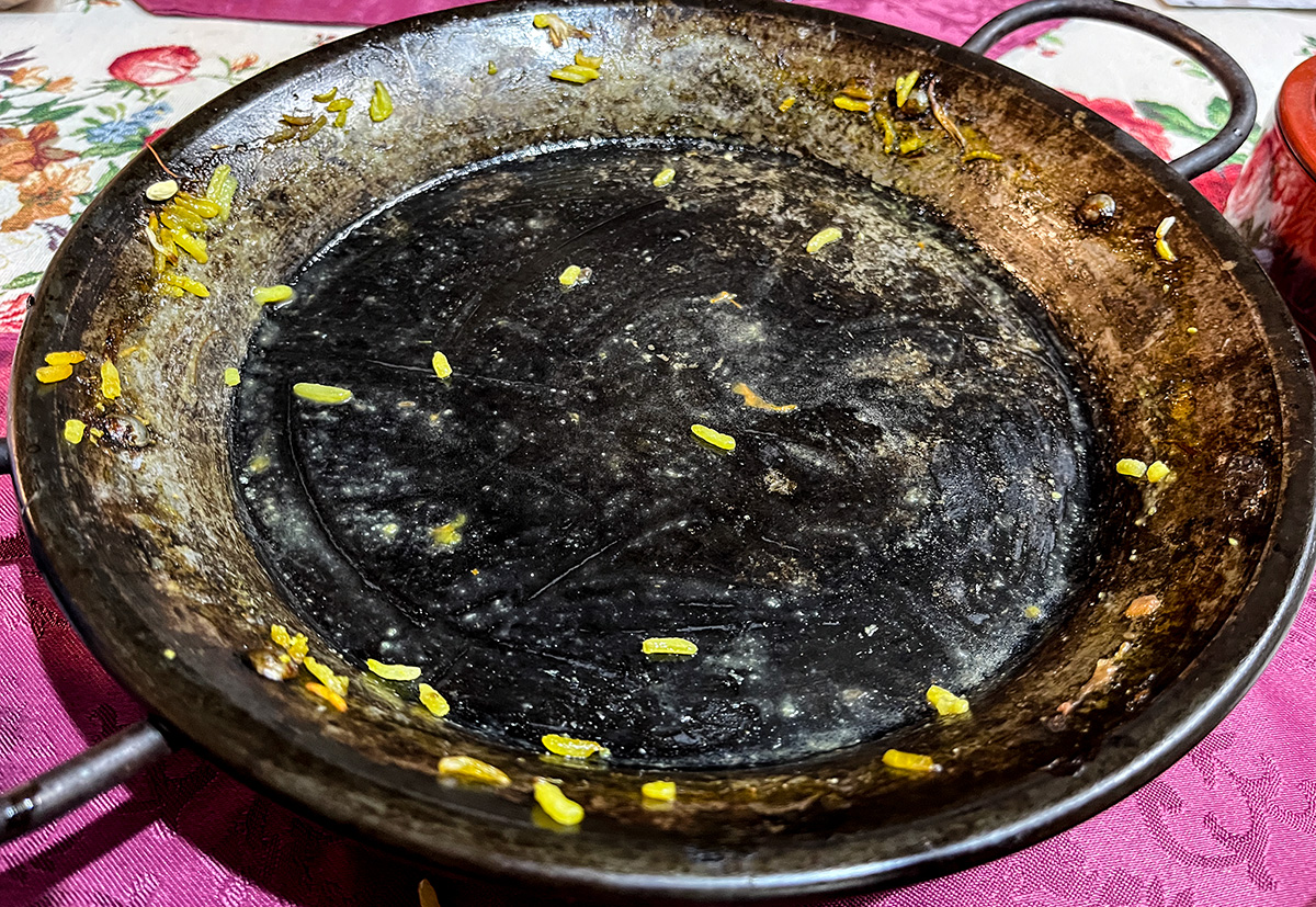 sep.24th sun.2023 パエリャ。昨日より美味くできたかな。昔コスタブランカをやっている頃は家でもよくパエリャを作った。いくつかあるパエリャにはそれぞれ名前をつけていて、ピカソのパエリャもそのひとつ。 パエジャ鍋でニンニクと唐辛子をたっぷりのオリーブオイルであっためたら海老や野菜を加えて炒める。さらにジャスミン米を加えて炒める。野菜や海老やアサリはいったん取り出し、そこへスープを注ぎ沸騰させる。 それに野菜や鶏肉を加え、アサリは身を米にうめて220度のオーブンで20分ほど焼いたら、そこに海老を加えて10分ほどさらに焼いたらおしまい。 取り出したらくし切りにしたレモンを配置してできあがり。 私はタイ米のぱらっとしたのが好きだけど、日本米でもうまくできるし、妻はタイ米より日本米の方が好みだ。 残ったら翌朝、チンしても美味い。そこのお焦げがまた美味いんだよね。 パエリャ鍋は水につけて残った米を取り除いたら、よく水気を切り、コンロであっためて完全に乾燥させてもいいけど、オリーブオイルを塗ってからしまうといい。