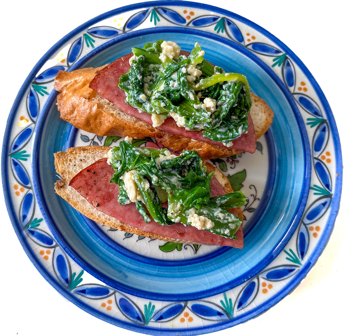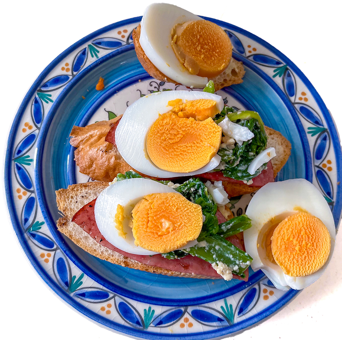 baguette with mustard greens with mashed tofu dressing,sausage cilantro and boiled eggs