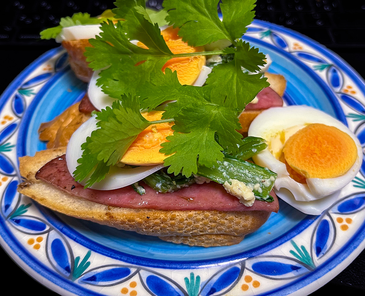 dec.16th tue. 2025 morning baguette with cheese, boiled eggs and cilantro いつもの朝のバゲットは、片面を炙ったバゲットをひっくり返す。 それにとろけるチーズを乗せて、タルタルソースとレベーベーストをトッピング。 チーズが溶けたらスライスしたゆで卵にパクチーをトッピング。 あとはアイスコーヒーとともにモーニング。…
