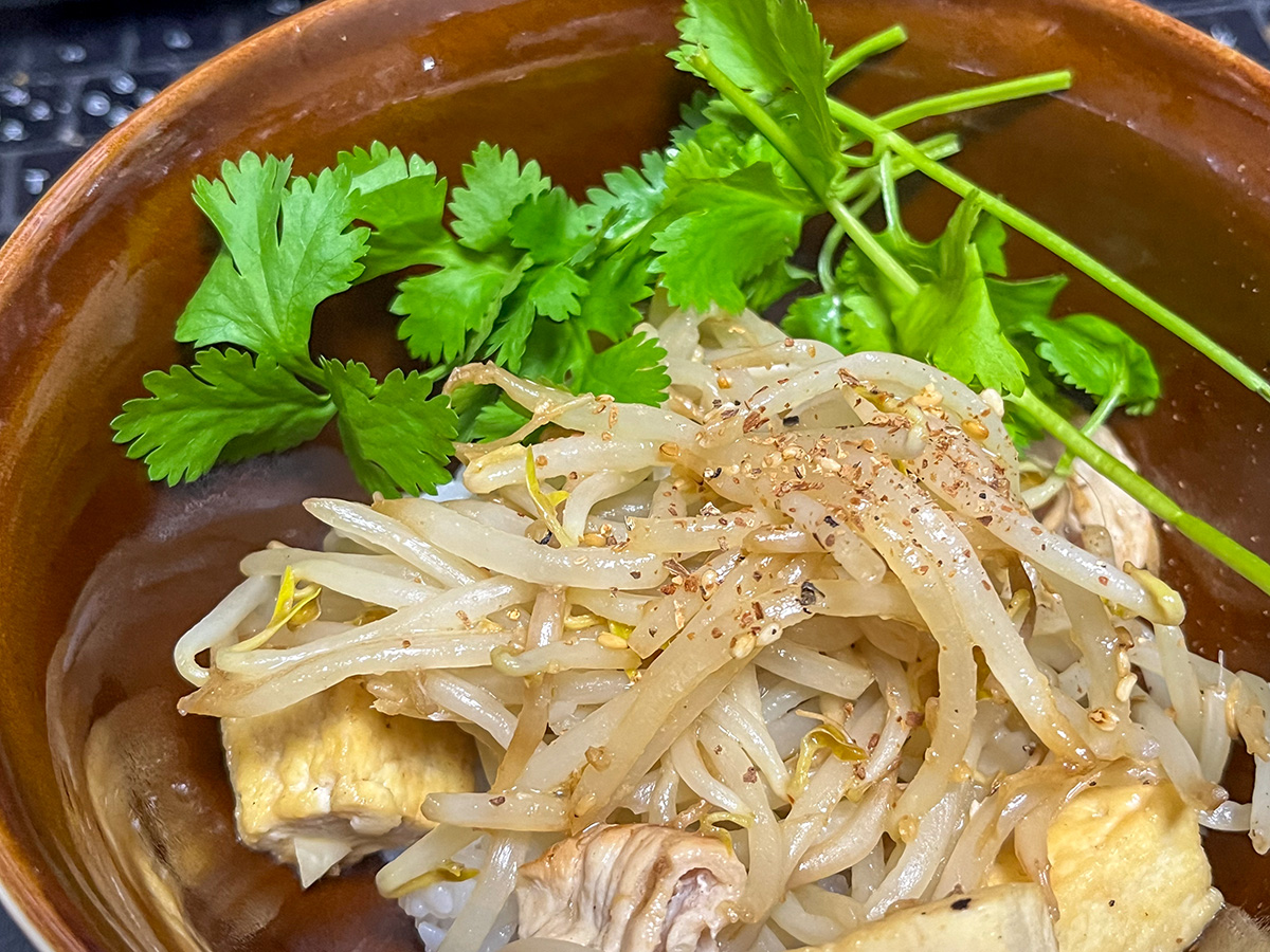 昨夜のもやしたっぷりな豆腐チャンプルーの残りを使って朝の丼飯。