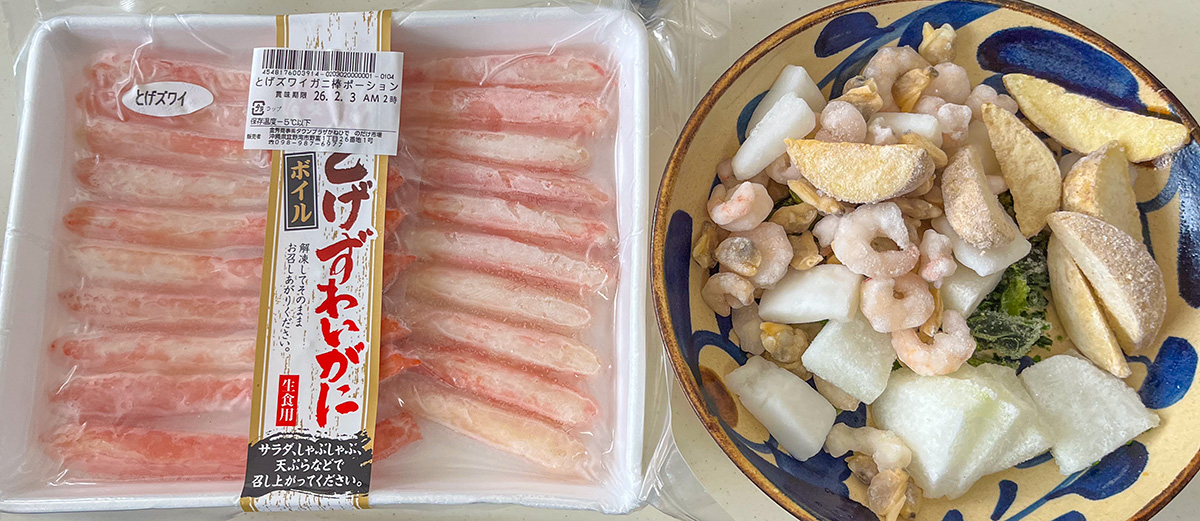 かねひでに、とがずわいがにって名前のカニが600円ちょいで売っていたから作ってみたくなった。あとは冷凍のシーフードとポテトにイカを使用。
