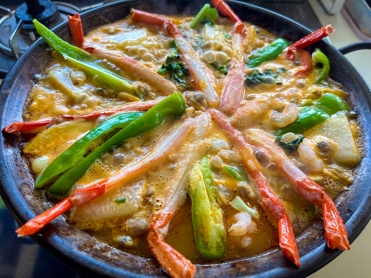 sep.24th sun.2023 パエリャ。昨日より美味くできたかな。昔コスタブランカをやっている頃は家でもよくパエリャを作った。いくつかあるパエリャにはそれぞれ名前をつけていて、ピカソのパエリャもそのひとつ。 パエジャ鍋でニンニクと唐辛子をたっぷりのオリーブオイルであっためたら海老や野菜を加えて炒める。さらにジャスミン米を加えて炒める。野菜や海老やアサリはいったん取り出し、そこへスープを注ぎ沸騰させる。 それに野菜や鶏肉を加え、アサリは身を米にうめて220度のオーブンで20分ほど焼いたら、そこに海老を加えて10分ほどさらに焼いたらおしまい。 取り出したらくし切りにしたレモンを配置してできあがり。 私はタイ米のぱらっとしたのが好きだけど、日本米でもうまくできるし、妻はタイ米より日本米の方が好みだ。 残ったら翌朝、チンしても美味い。そこのお焦げがまた美味いんだよね。 パエリャ鍋は水につけて残った米を取り除いたら、よく水気を切り、コンロであっためて完全に乾燥させてもいいけど、オリーブオイルを塗ってからしまうといい。