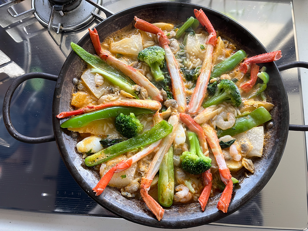 jan.6th tue. 2026 今夜は久しぶりにパエリャを作ろう。 いろんな野菜と北海道からのホタテやカニ爪に海老などちょっとちょっと豪華に。 カニ爪とホタテをちょっと煮込んでだしをとったら、 ジャスミン米をニンニクとオリーブオイルで炒めサフラン水を加え、沸騰させたら具材をのせ、220度にあっためたオーブンに30分ほどいれたら出来上がり。 ややふっくらライスだったけど、もっと焼いた方がよかったかな。 でも、久しぶりに美味いパエリャだった(^ ^ 関連サイト:Facebook┃Twitter┃おきぐる┃Facebook┃Twitter┃おきぐる┃okinawaweb┃南風原タウン情報┃チーズ教室 ┃Okinawaweb Express┃mixi┃グシクムイ ブログ┃…
