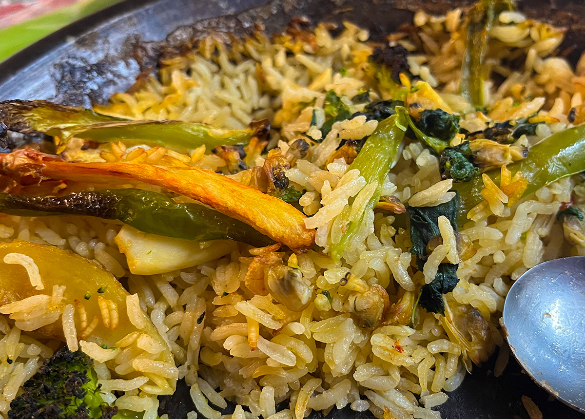 ジャスミン米をオリーブオイルで炒めたら、だし汁を注ぎ、解凍したシーフードやピーマンなどをトッピングして煮る。