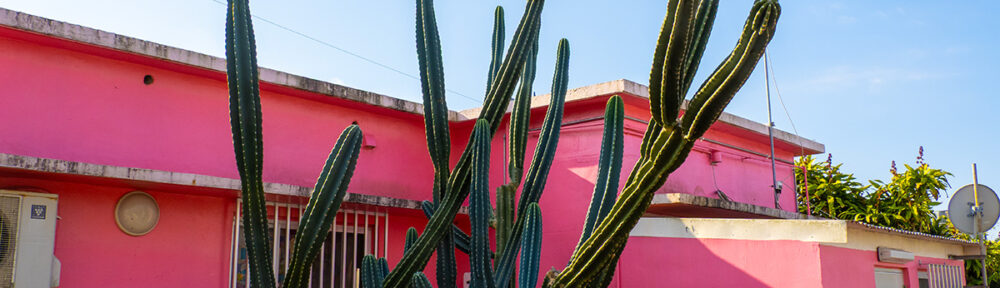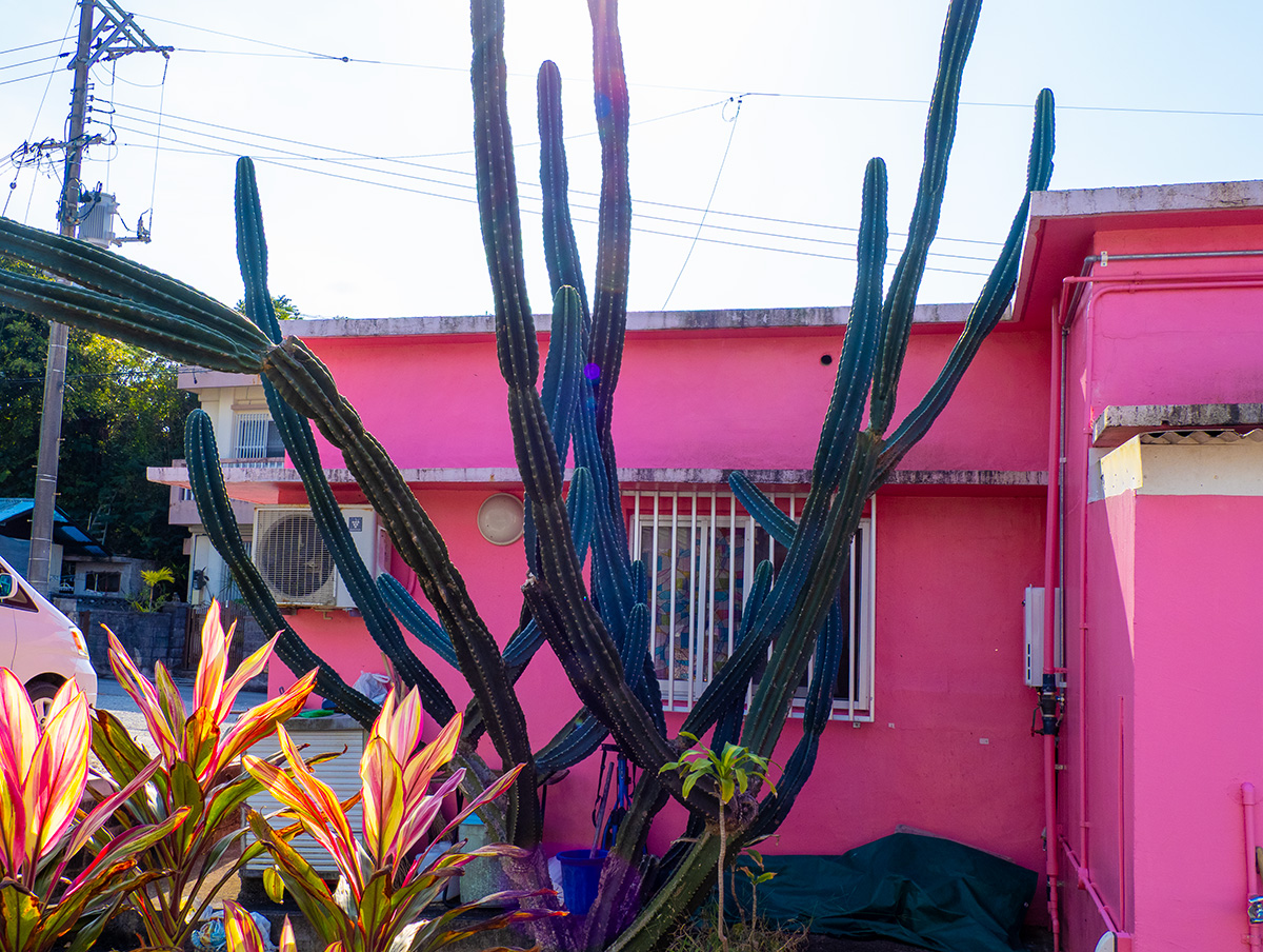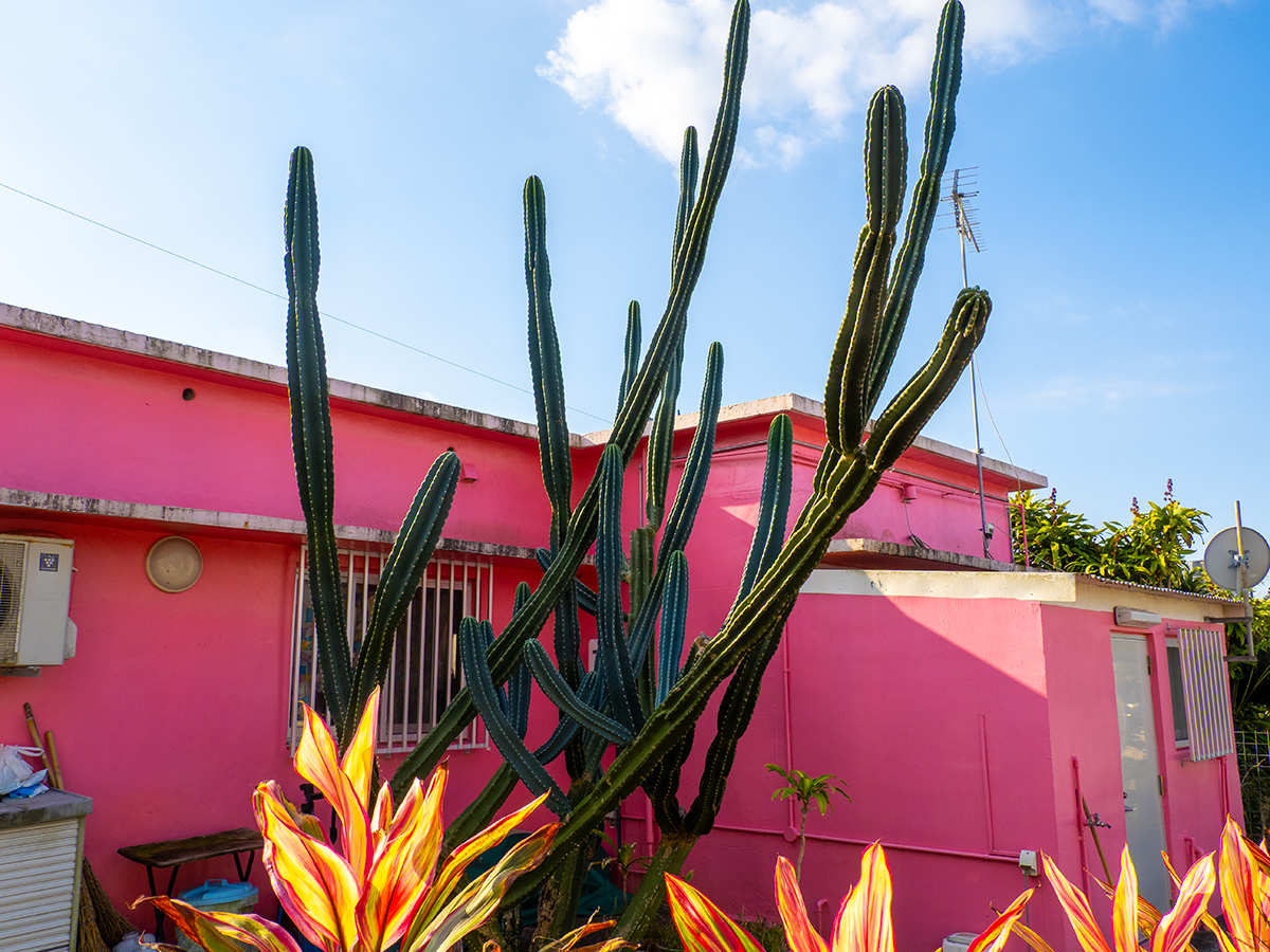 星乃珈琲に行くたびに見る見事なサボテンとそれに対するコーラルピンクの色の家。
