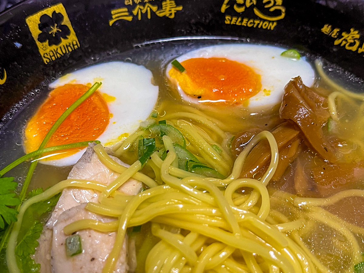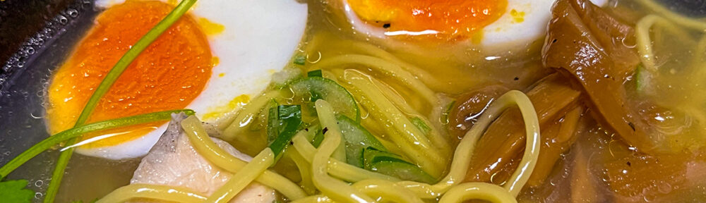 麺と一緒に白ネギを煮込み、仕上げにサラダチキンの水ライスにタマゴとメンマに青ネギとパクチーをトッピング。