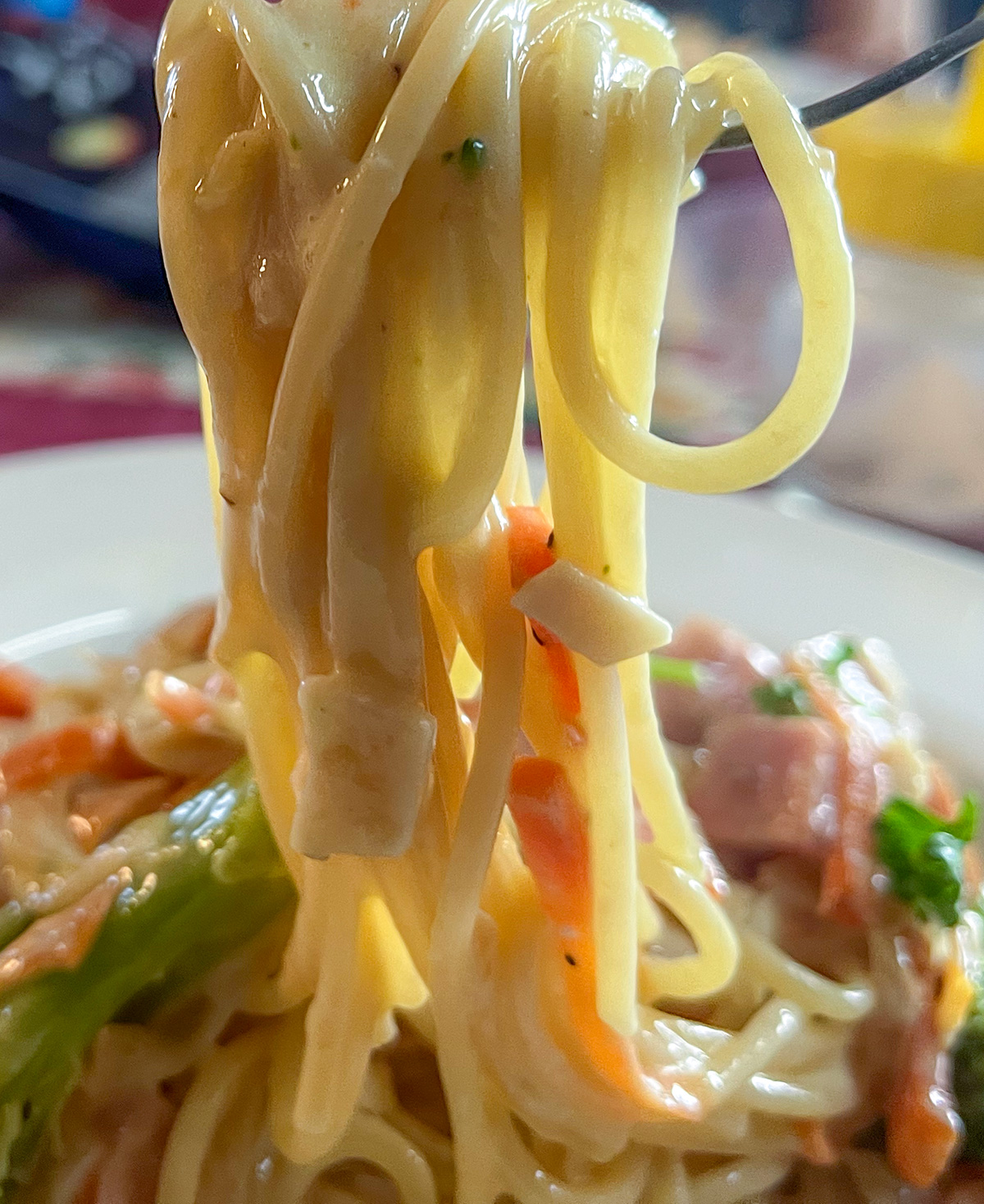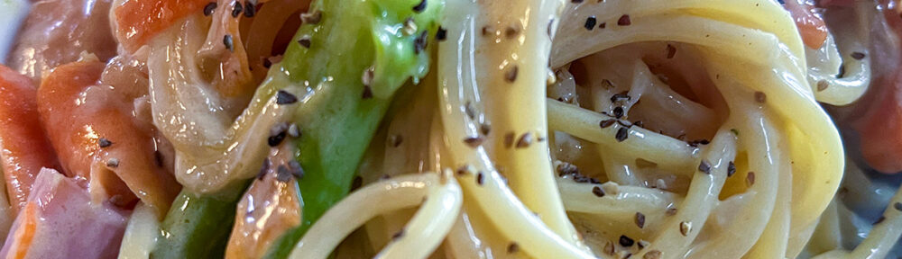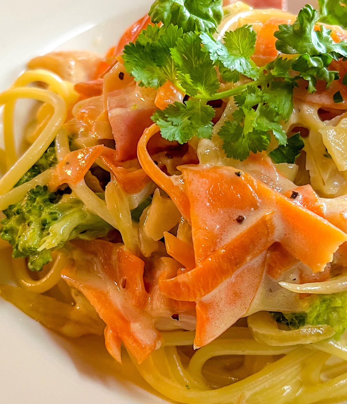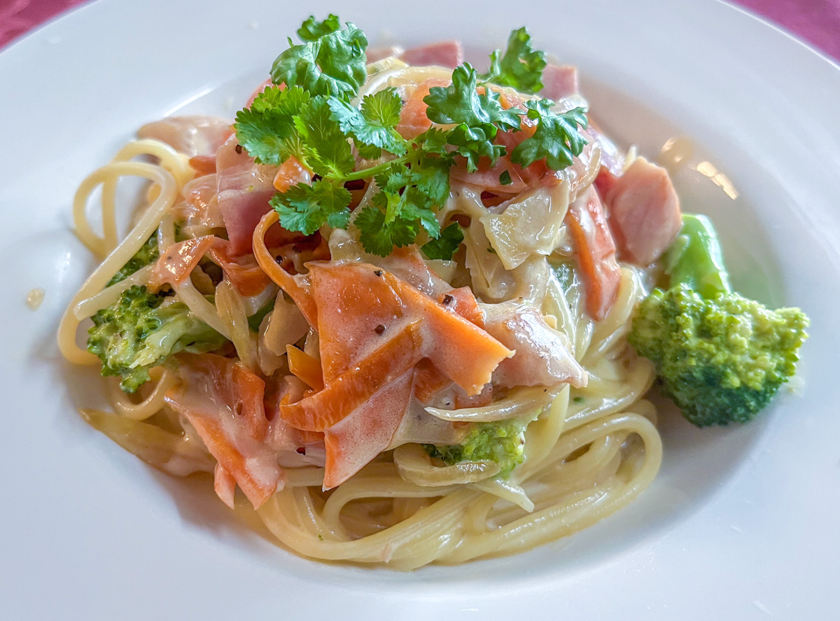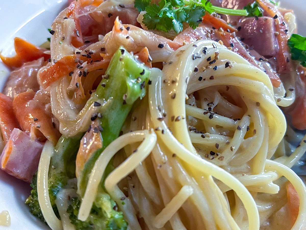 シンプルなペペロンチーノもいいけど、ハムやキャロットにブロッコリーたっぷりなクリームソースのスパゲッティ。