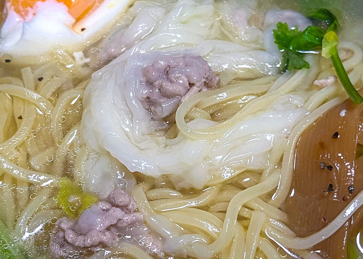 ひき肉をつめたワンタンに白菜の小口切りにゆで卵とメンマにパクチープラスで味も倍増。これはまた買おう
