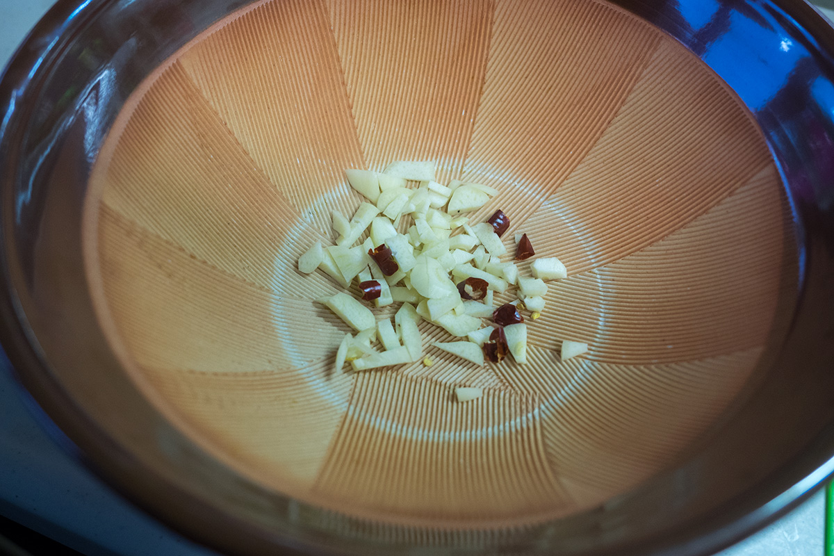 刻んだニンニクと赤唐辛子にナッツや時には花椒をすり鉢にいれてゴリゴリ。