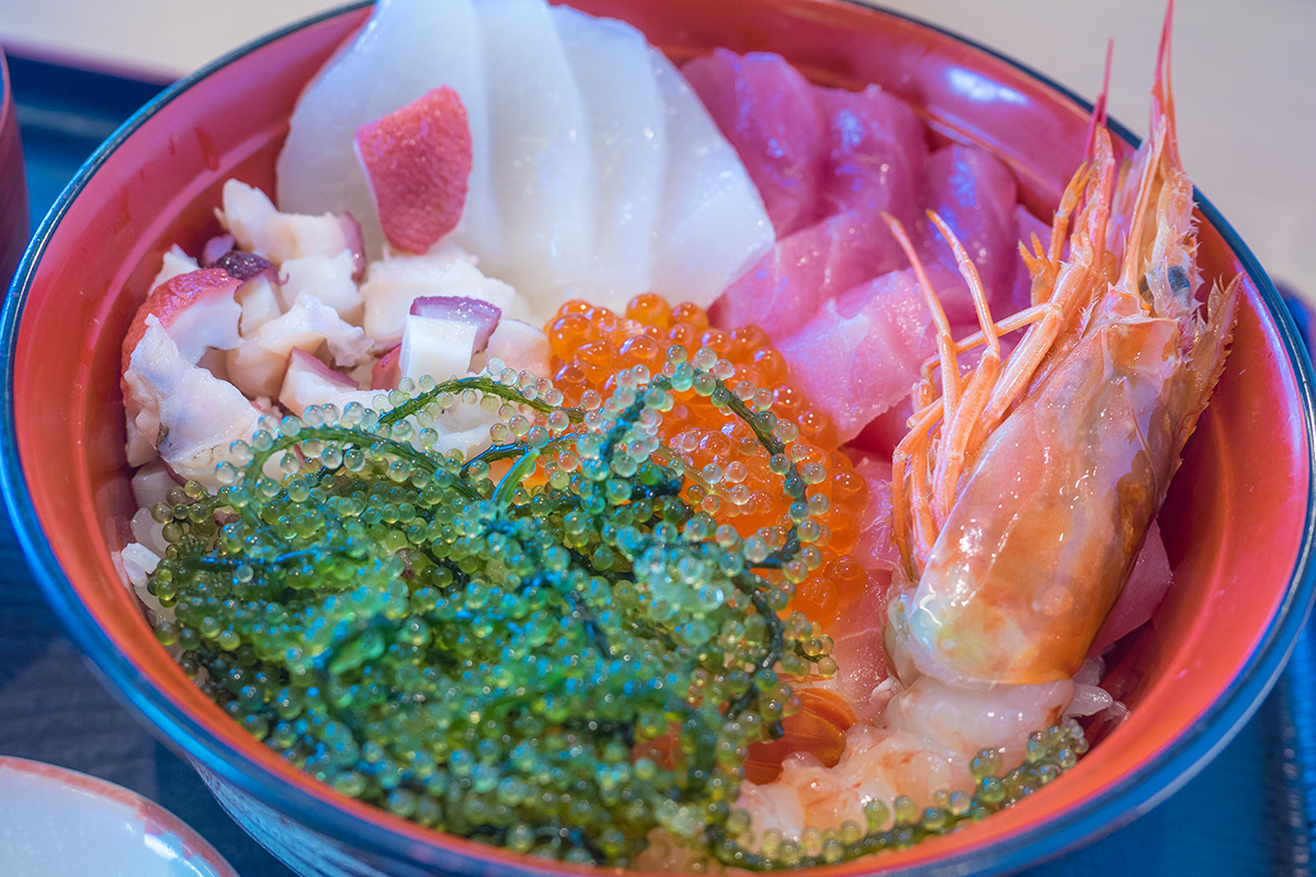 マグロ、イカ、タコ、エビにイクラと海ぶどうがトッピングされている。