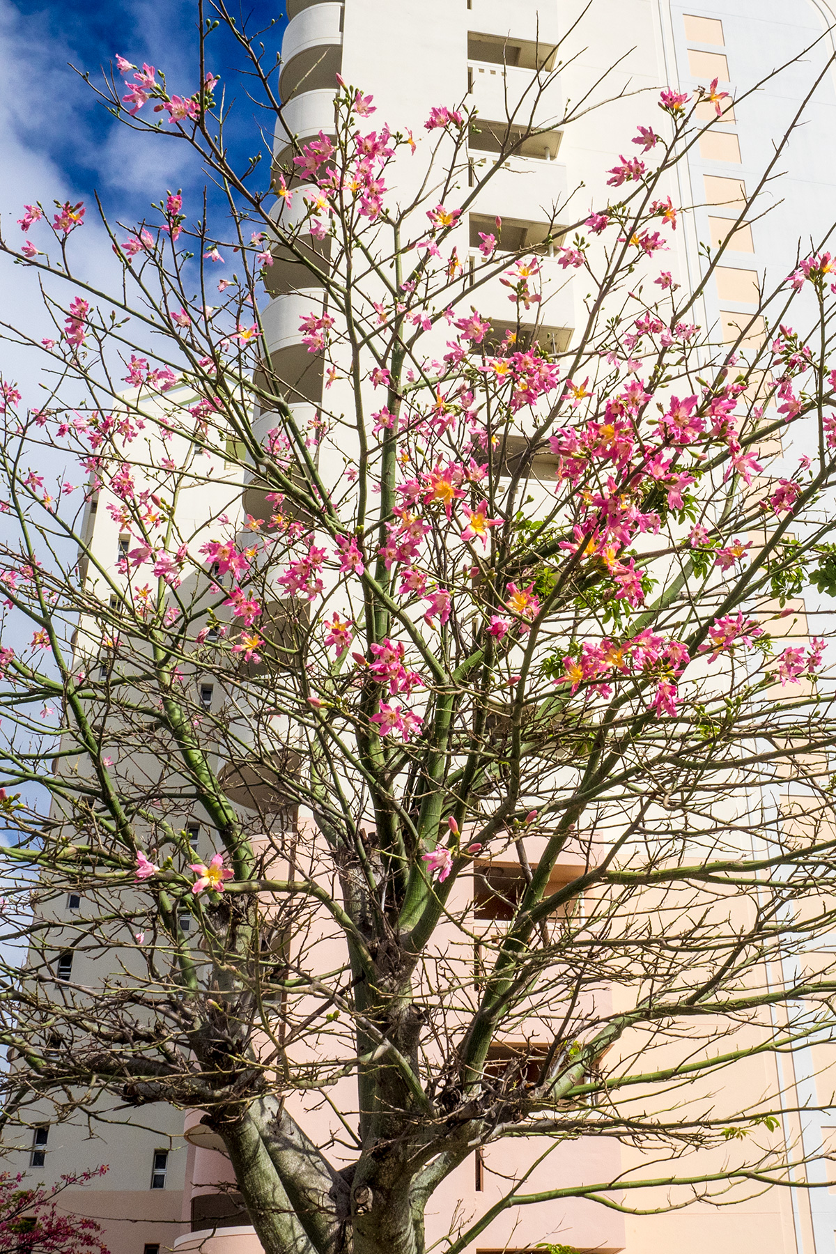 この通りはトックリキワタ並木が今は満開で濃いピンクの花を咲かせているんだけど、その中の1本だけが真っ白な花を咲かせている。
