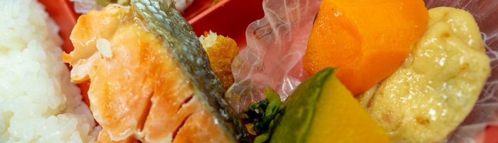紅鮭がドンの載っていて、かぼちゃの煮物、ささみ巻きカツ、切り昆布煮、小松菜のおかか和えや卵焼きとがんもどきなど。
