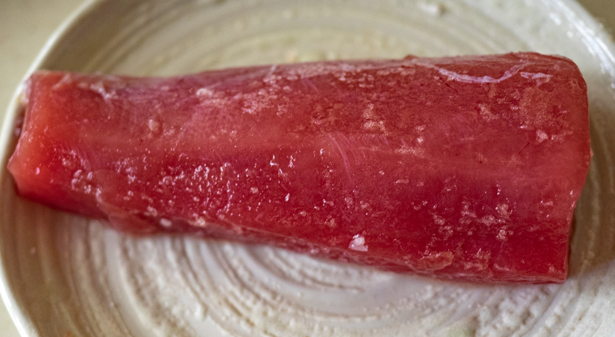 作り方は簡単。まぐろのサクをかってきたら塩をまんべんなく振り20分放置。