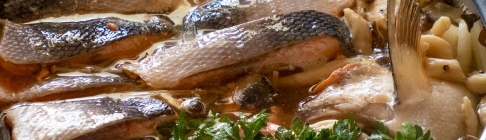 同じく北海道からの丸ごとの鮭もチーフの手に捌かれて、バター焼きや鍋に。