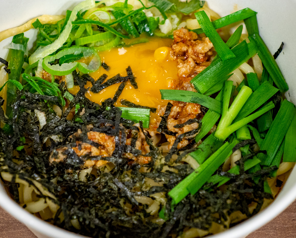 卵黄に味付けひき肉、ニラとネギに海苔がトッピングされている。