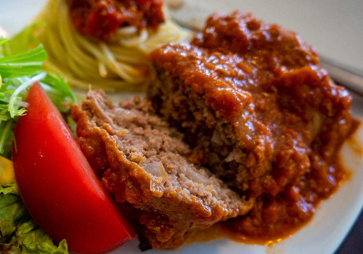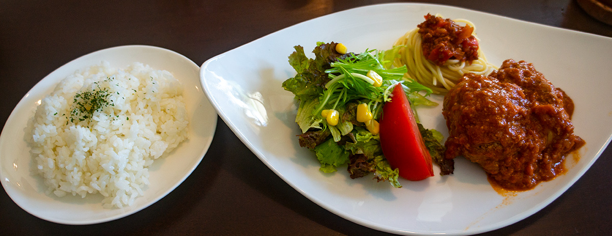 いつもながらたっぷりのサラダは美味いし、ミートスパゲッティもいつもよりボリュームあるかな。肉巻きなのはちょっとわかりにくいけど歯触りのいいハンバーグだ。
