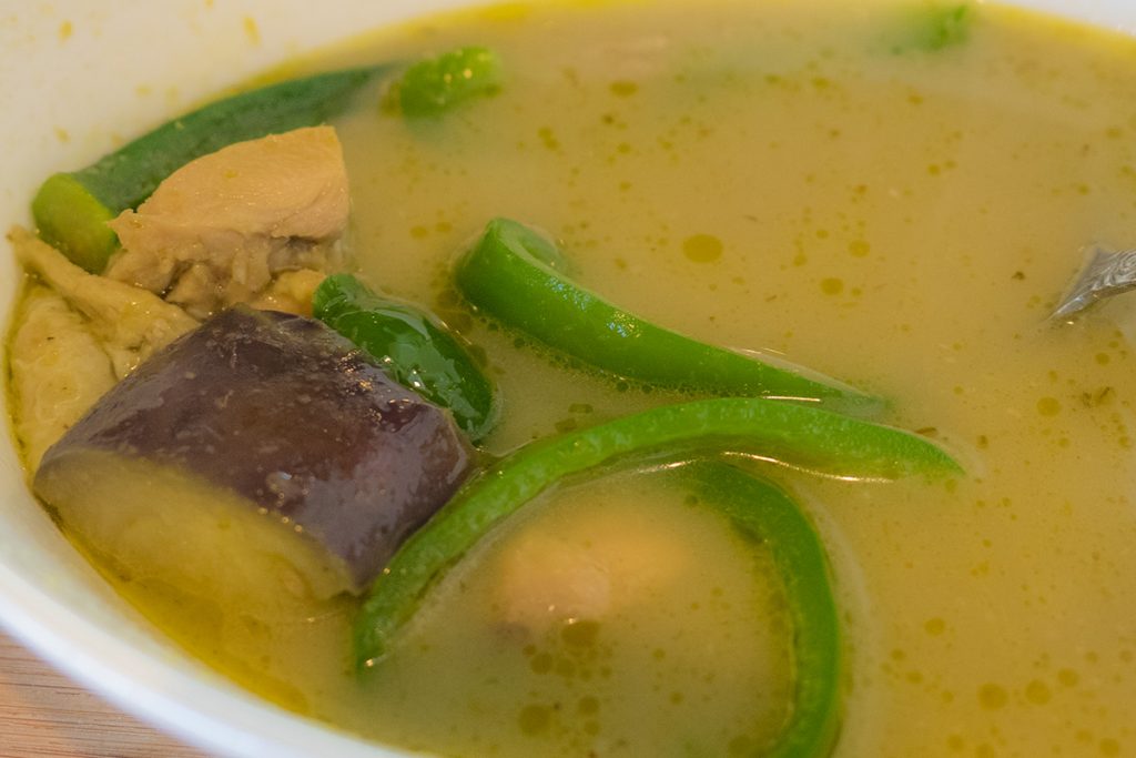 チキンやナス、ピーマン、インゲンにオクラなど具沢山なスープタイプのグリーンカレー。