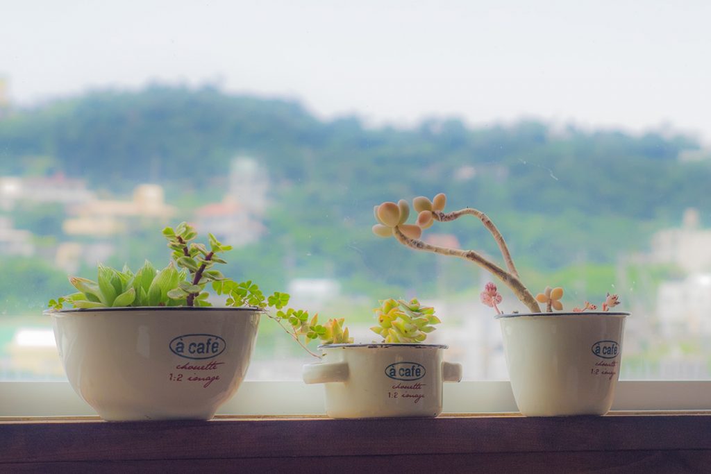 窓際には小瓶や小さなプランターが置かれていて、窓から見える風景もいい感じ。