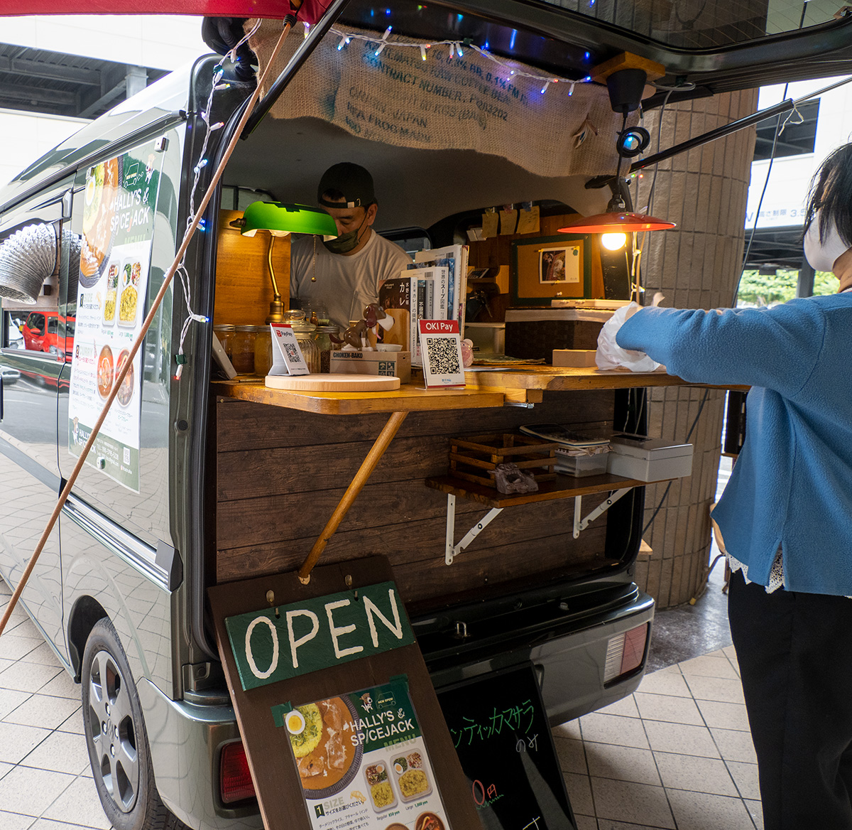 ふと外の移動販売のクルマが来ているかなと外にでたらハリーズカレーがいた。浦添の店にはいったことあるけど、移動販売もあったんだ。