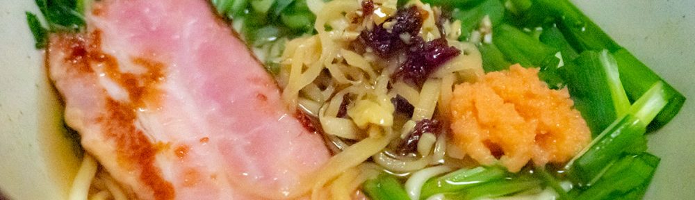 サンフティーマリウボウで売っているサン食品の沖縄そばシリーズは1袋200gと小家族にも嬉しいサイズ。種類もいろいろあってお気に入りだ。 よく買うのは首里そばだったりするんだけど、今日は生よもぎそばにしてみよう。 茹で時間は2分半だけど、ちょっと短めにしてみた。 菊水の野菜ラーメンをつく時に残しておいた白菜とハムの炒め物に加えて生のよもぎの千切りをトッピング。本当はジャノベーゼ風のフーチバージェ作りたかったけど、ちょっと面倒なのでそれは次回へ。 仕上げは生の生姜の千切りと赤唐辛子に島唐辛子をトッピング。 この麺、ツルシコじゃなくて、ごわっとした歯触りでコシも強くて美味い。 やっぱり茹で時間は短めの方がいいな。 仕上げに島唐辛子もトッピングしたのでけっこうスパイシー。 なかなか美味い。 伊佐製麺所のよもぎそば 関連サイト:Facebook┃Twitter┃おきぐる┃Facebook┃Twitter┃おきぐる┃okinawaweb┃南風原タウン情報┃チーズ教室 ┃Okinawaweb Express┃mixi┃グシクムイ ブログ┃ (adsbygoogle…