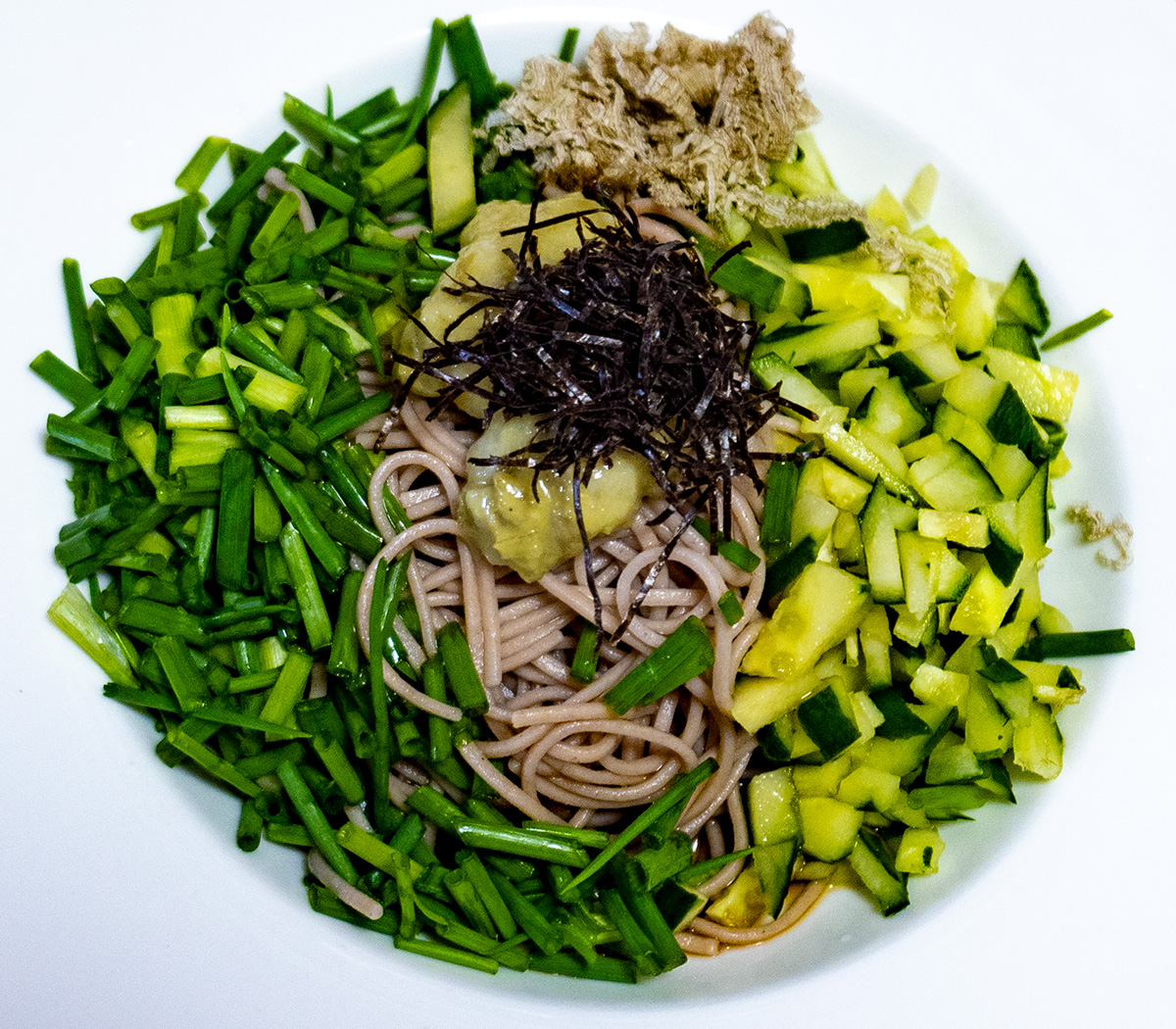 june 5th sun. 2022 日曜の朝は、ネギやパクチーに追い茎本わさびと大根おろしたっぷりの蕎麦で。 大根おろしって作るために大根を買うのもめんどうだしあまるのでハウスのチューブ入り大根おろしを買ってみた。ちょっと生の大根おろしとは違うけど手軽で便利。 追い茎本わさびは、ロジャースのフードマーケットで見つけたもの。 確か1000円くらいなのでちょっと考えたけど、赤坂のなみだ蕎麦のわさびを思い出してあの味が再現?できないかなと思って買ってみた。わさびの葉もあればなぁ(^ ^; 十割蕎麦を湯がいて蕎麦湯は少し取り出し、蕎麦はよく洗い氷水でしめたら水気をよく切り皿に盛り付ける。 周りにネギの小口切りやざく切りに湯通ししたニラを配したら大根おろしと追い茎本わさびをトッピング。 ネギに小ネギにニラとパクチーでグリーン&グリーン.。 十割蕎麦は歯触りも喉越しもいい。 美味いけど、赤坂のなみだ蕎麦の上をいく強烈さ(^ ^;…