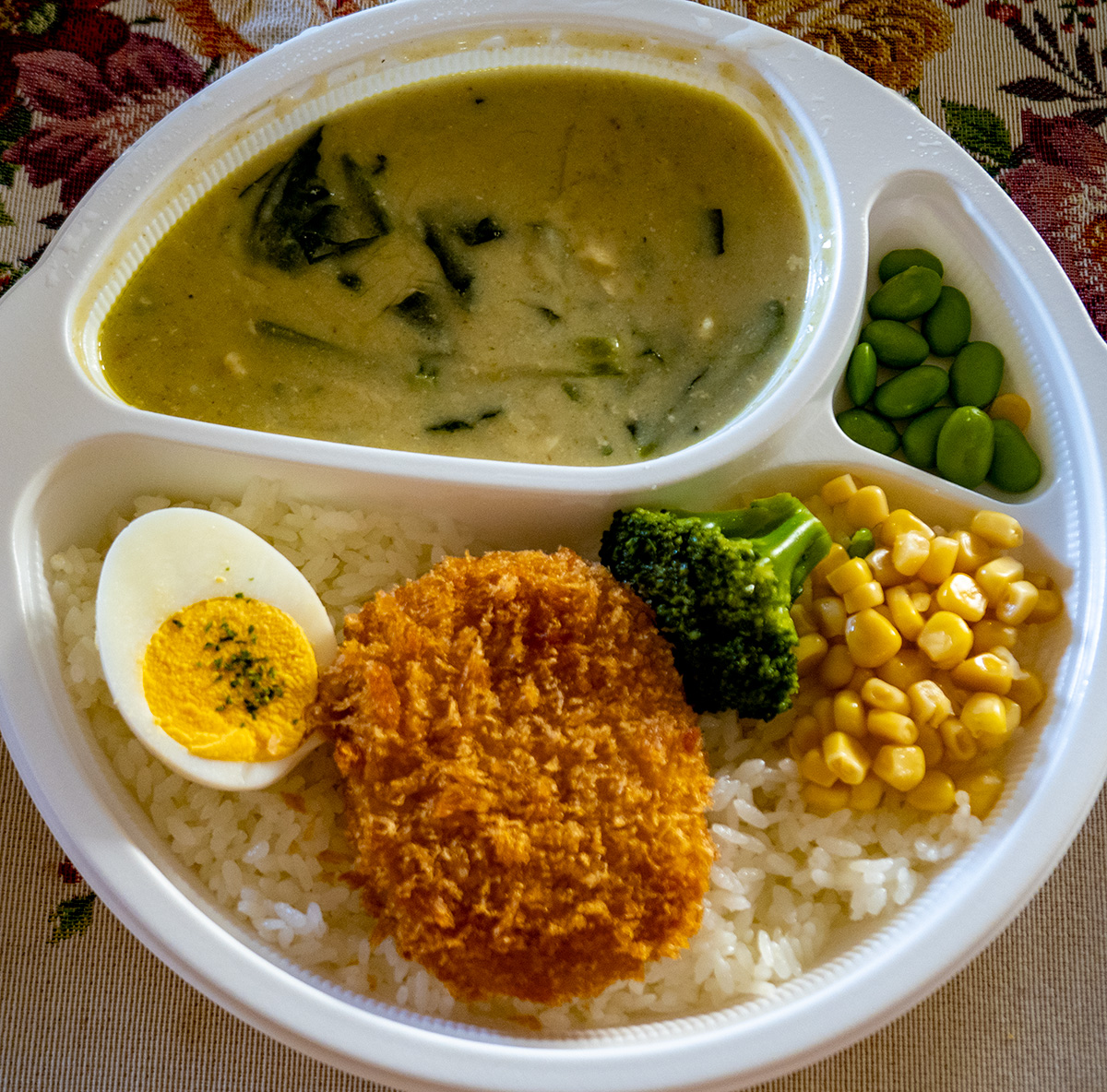 june 5th tue.2022 よろず相談の毎週火曜行っている沖縄市サテライトはプラザハウスの3階のライカム・アンソロポロジーで。きたなか荘弁当2号店の火曜のメニューはグリーンカレー。 配達の途中で寄ってくれたのでこの本格的カレーは持って帰って夕食に。 しっかりスパイシーな本格的なグリーンカレーで美味い。 しっとり柔らかなチキン、しっとり美味いコロッケにパプリカにゆで卵とコーンに枝豆にタケノコと具材も豊富で嬉しい。 ぼりゅーむたっぷりで、お腹いっぱいで満足な一品だ。 これで500円はかなりのお値打ちプライス。 明日の水曜は新しいメニューの天津飯のようだ。天津飯はなかざ家で食べて好きなメニューになったけなぁ。きたなか荘弁当のも楽しみだ。いつか食べたいぞ。 きたなか荘弁当の過去記事:┃冷めても美味いカレーと唐揚げ弁当┃チキンソテーやハンバーグ弁当┃クリームシチューとハンバーグ弁当┃鯖にハンバーグや白身フライ弁当┃マスクとミートソース┃タコライスに人参シリシリー┃トマトソースでナポリタン┃ よろず支援拠点カルテ@沖縄 CASE280 知名度も販売先もUP!-きたなか荘弁当- ┃マスク&ランチボックス┃白身魚フライとマスク┃トマトのまごころギフト┃宮古浜口水産の鰹ちゅう汁ときたなか荘弁当のトマトソース┃ヘルシーボリューム弁当┃グリーンカレー2/10┃グリーンカレー2/17┃グリーンカレー&限定チーズバーガー┃日替わり弁当とグリーンカレー┃25品目のバランス弁当┃サバと白身フライ弁当┃コーヒーアンダギー&グリーンカレー┃オムライス┃中華丼┃10辛トマトケチャップたっぷりイタリアン┃ビビンバ丼┃グリーンカレー┃…