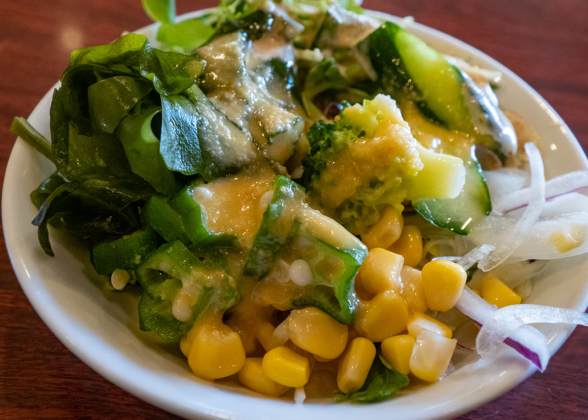 よく冷やされた野菜に3種類のドレッシング。ドリンクも数種類ある。