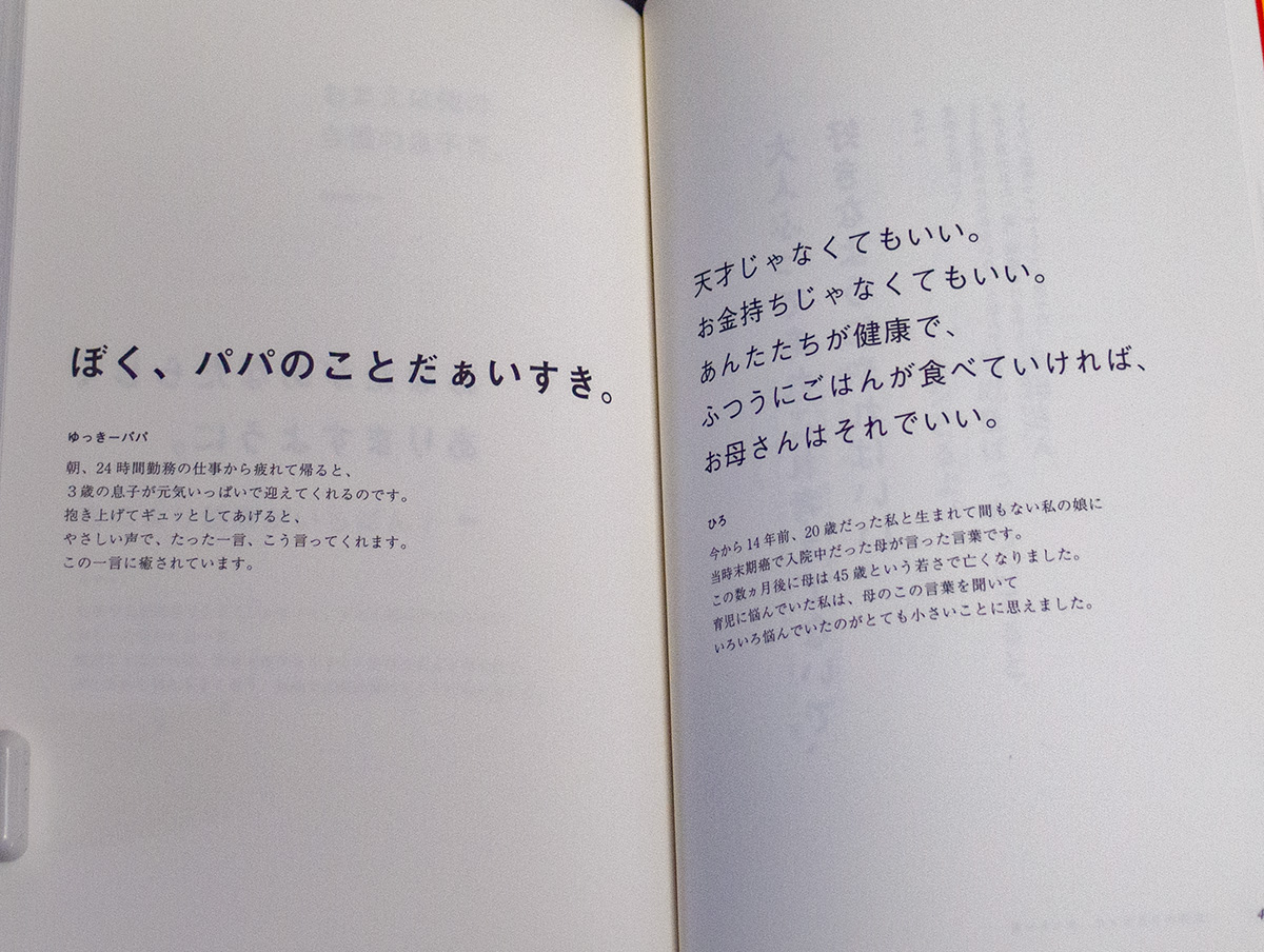 友人から、家族から、恋に悩んだときに、涙がこぼれそうになったときに、勇気をくれた、たった一言の5章からなっている。