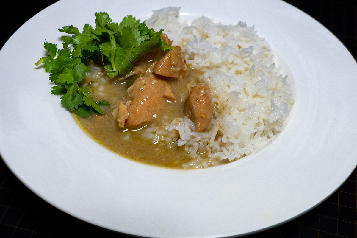 今日届いたジャスミンライスをあっためてグリーンカレーライス。