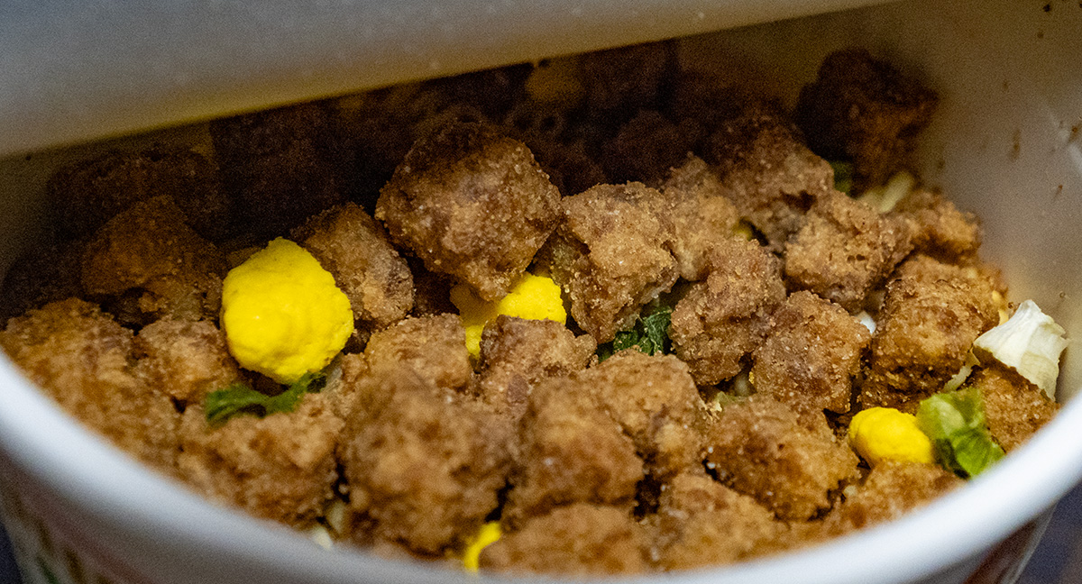 日清のサイトによると、通常品の約4倍量の謎肉がごろごろと入った謎肉特化型「カップヌードル」とのこと。