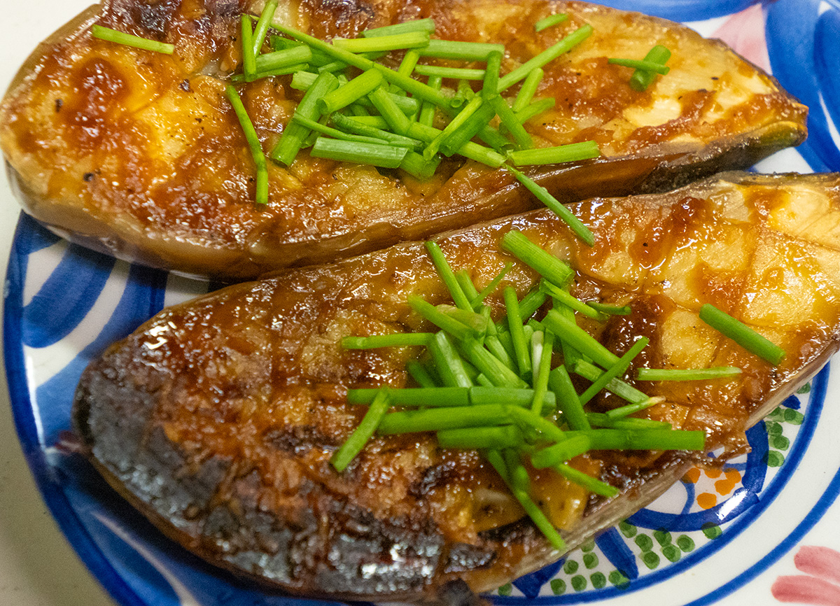 買ってきたナスはまずは半分に切ったら、包丁で10時に切れ目を入れる。