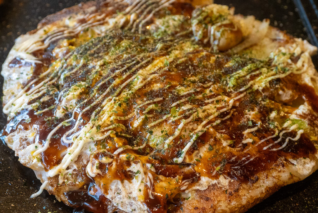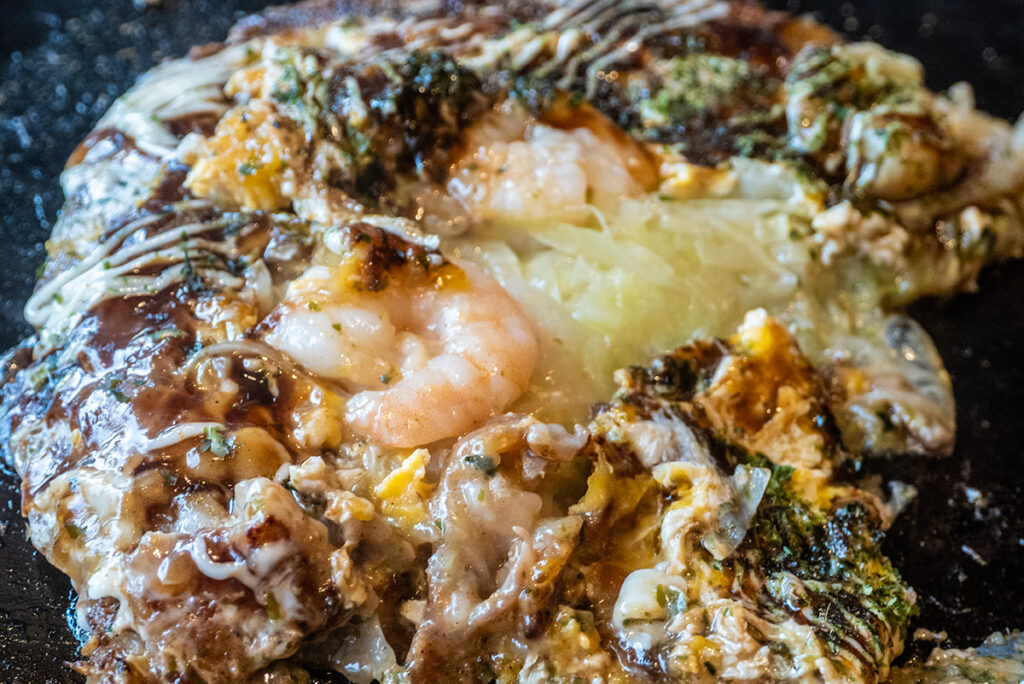 お好み焼きも豚と海老。たっぷりのソースとマヨネーズに青海苔と鰹節をふりかけたら、ヘラでカット。