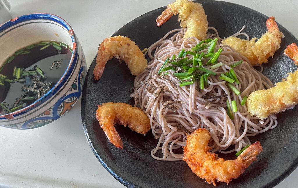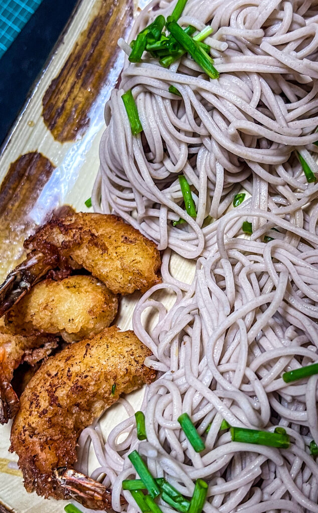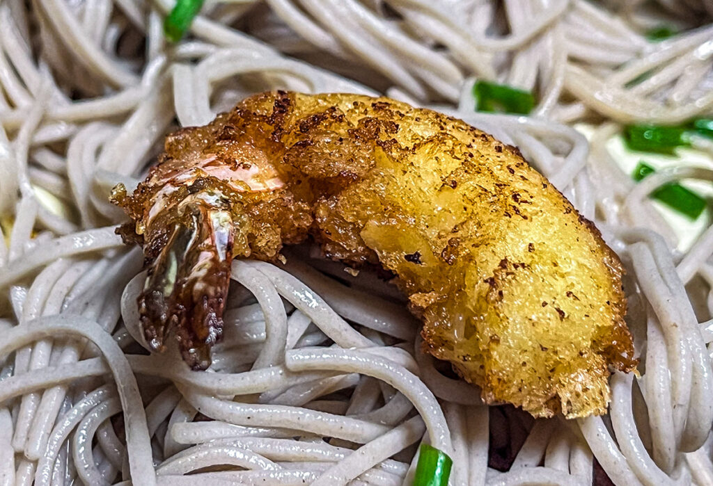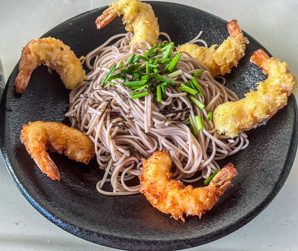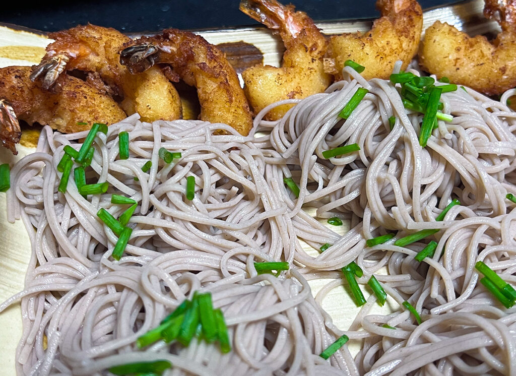 時間通り湯掻いて流水で洗い、冷水でしめた十割蕎麦を盛り、海老天を周りに配したらネギを散らしてできあがり。