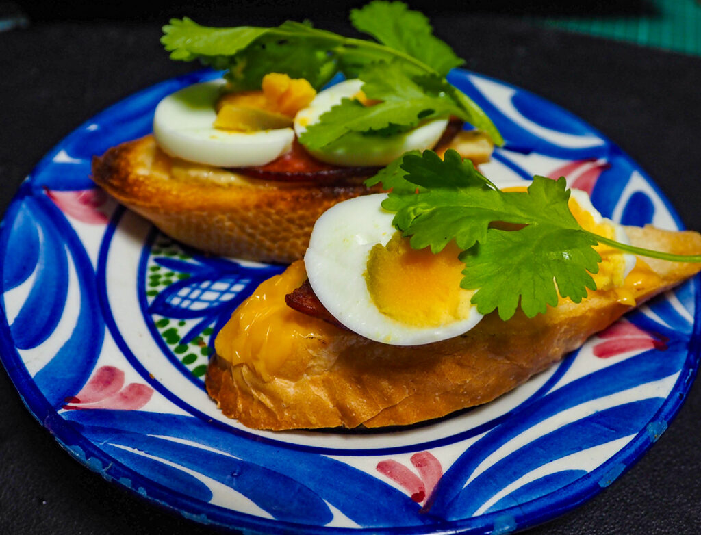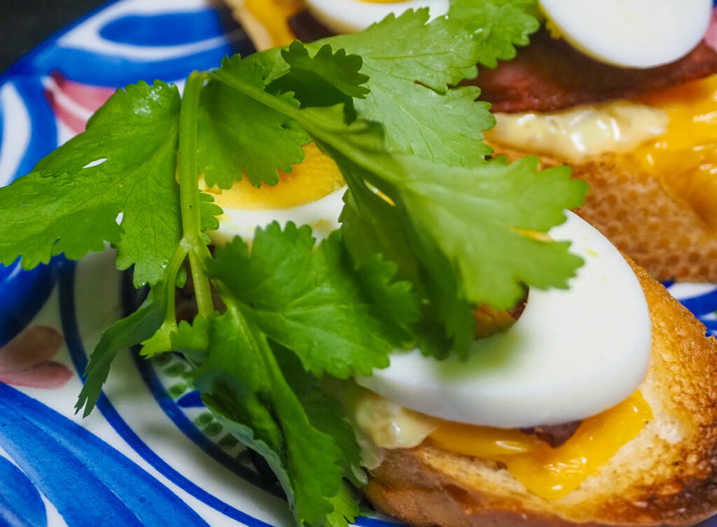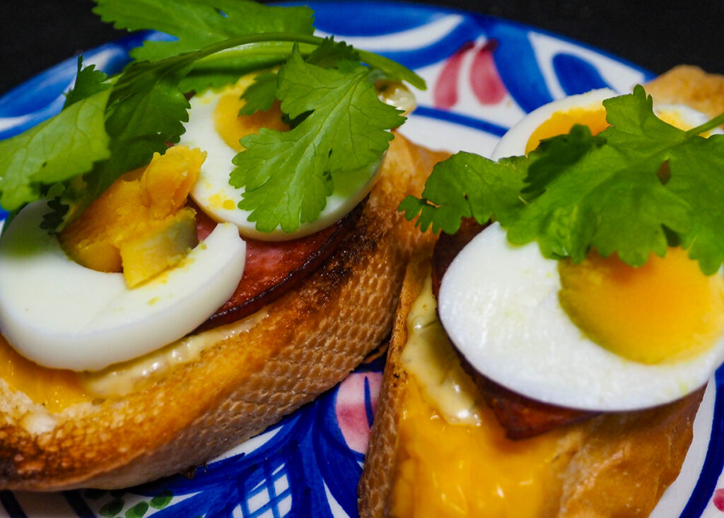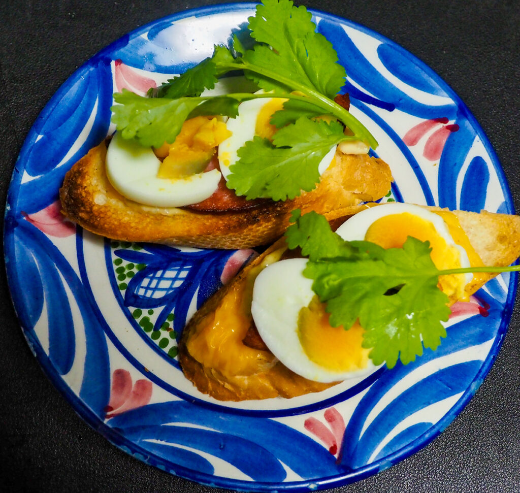 朝はバゲットにメルティングチーズを溶かし、ソーセージとゆで卵にパクチートッピング。
